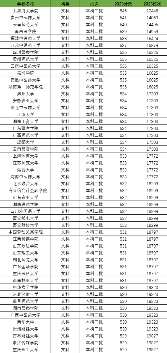 2023年全国各大学在四川文科本科二批中,录取分数最高的是上海海关学院,最低录取分数为545分,最低录取位次为12446名,分数较高的还有贵州中医药大学(541分)、云南师范大学(540分)、南昌医学院(539分)、福建中医药大学(538分)等。