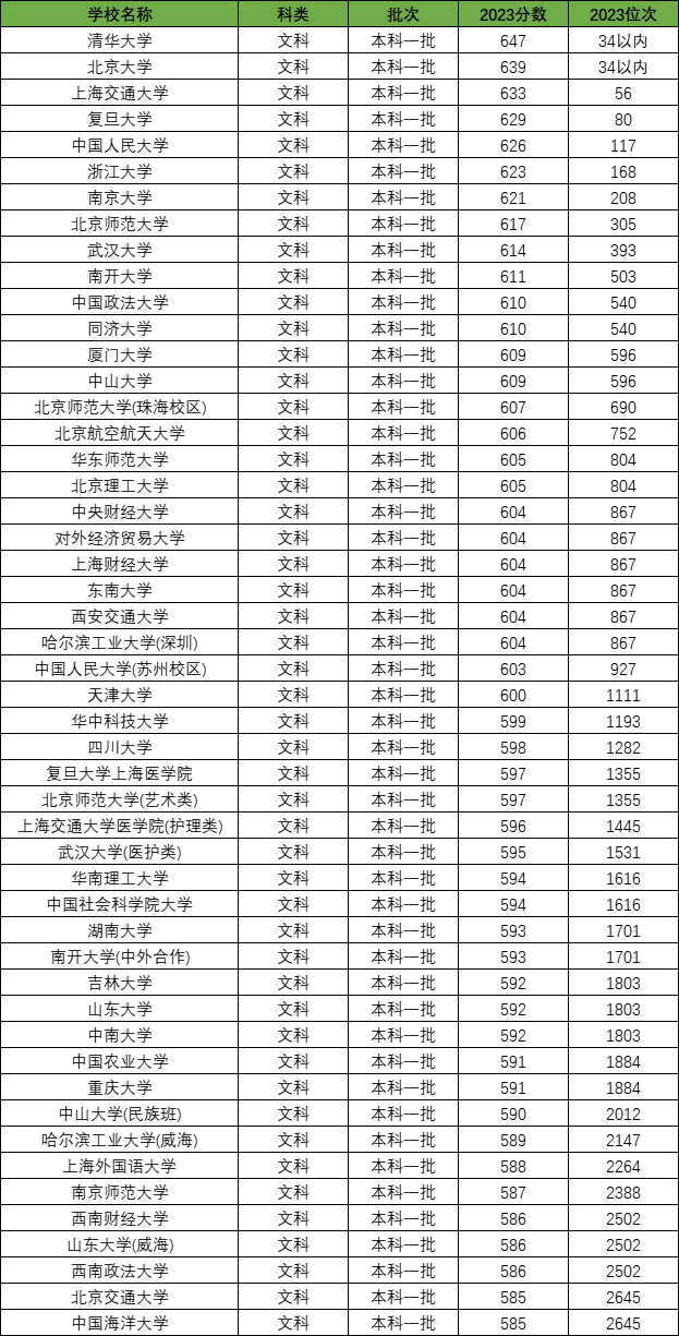 2023年全国各大学在四川文科本科一批中,录取分数最高的是清华大学,最低录取分数为647分,录取位次在34以内;文科录取分数超过630分的还有北京大学(639分)、上海交通大学(633分)。
