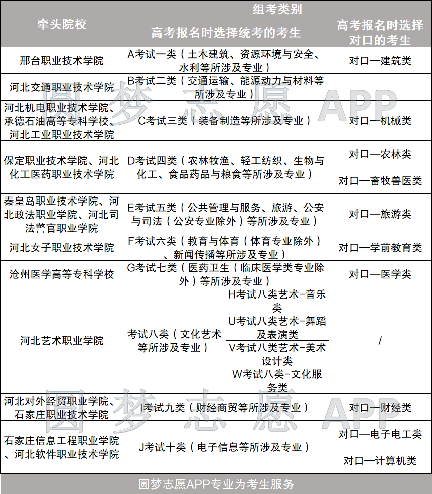 2021年河北省单招的招生专业继续划分为不同的考试类,实行院校联合考试招生。统考考生只要选择某一考试类报考,就会被认为向该类所有院校同时报考,考试成绩供该类所有院校使用,在填报志愿时可以选择所有院校的全部该类专业。对口考生可以不选择考试类,将默认按照考生高考报名时选择的类别。