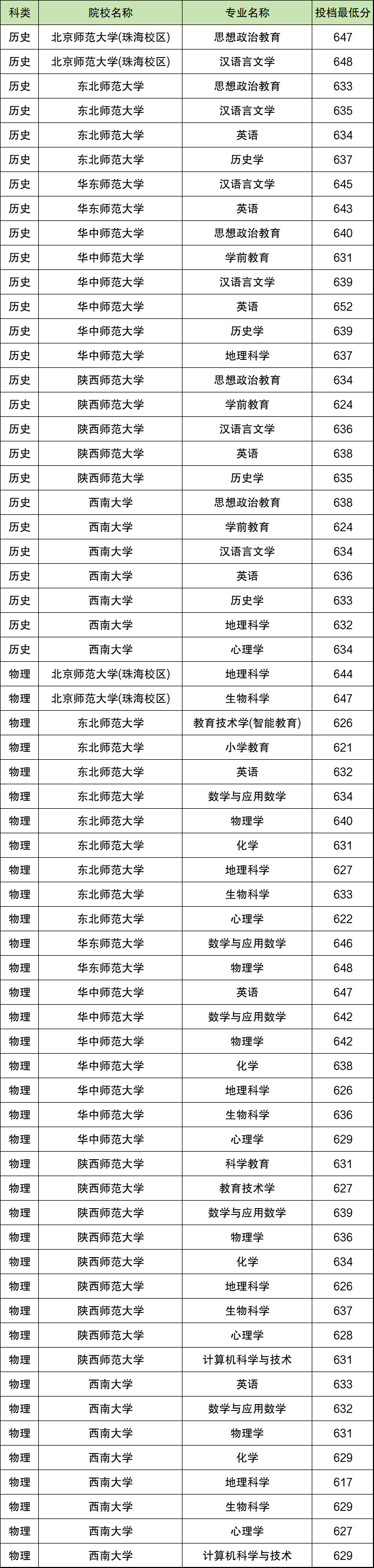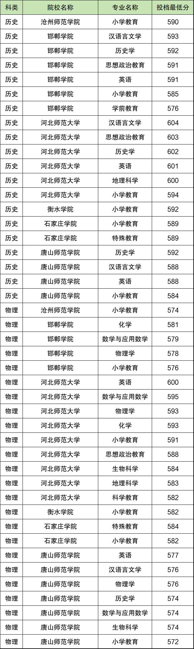 注:因为河北地方公费师范生同院校同专业定向不同地区,分数不同,以上仅为各院校各专业的最低分。