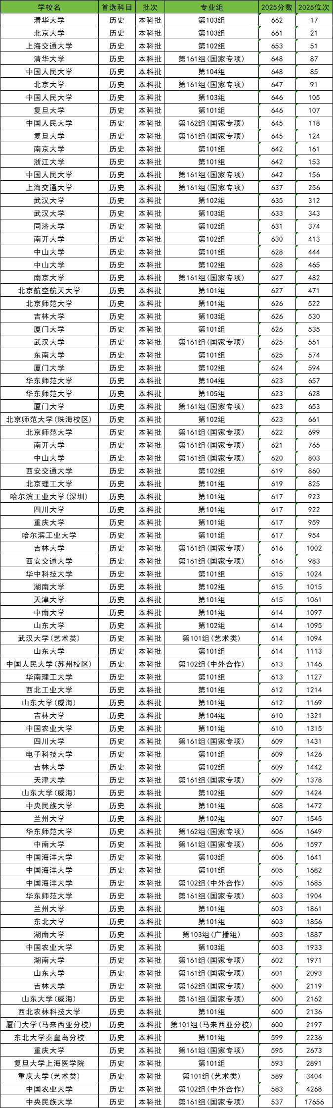 下面是985大学中历史类录取分数线最高的10所大学分数及位次详情: