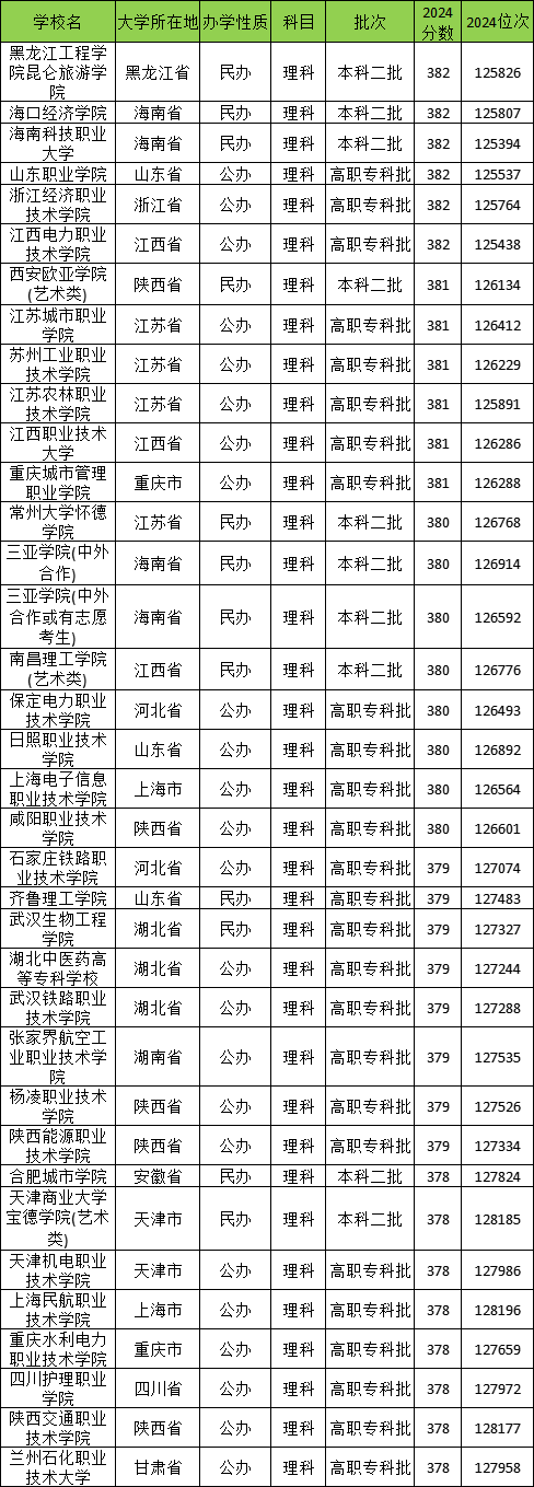 可以看到,2024年陕西省高考380分左右的理科考生可以报考海口经济学院382分、山东职业学院382分、浙江经济职业技术学院382分等。