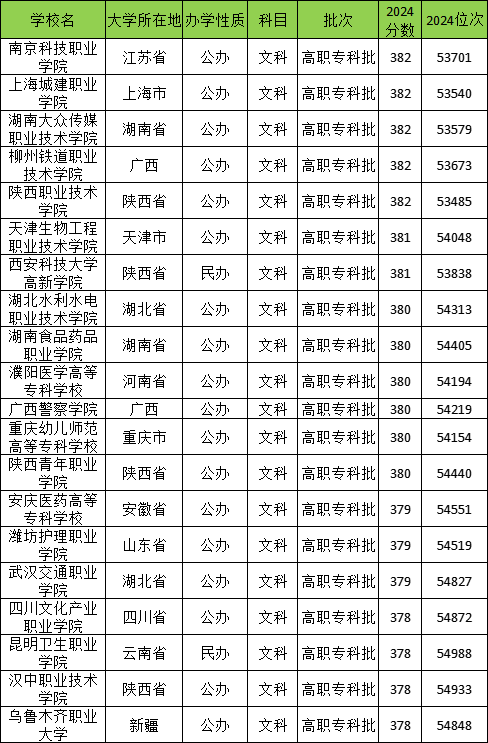 可以看到,2024年陕西省高考380分左右的文科考生可以报考南京科技职业学院382分、上海城建职业学院382分、湖南大众传媒职业技术学院382分等。