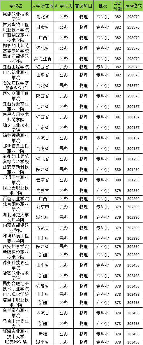 可以看到,2024年河北省高考380分左右的物理类考生可以报考恩施职业技术学院382分、甘肃畜牧工程职业技术学院382分、西安交通工程学院382分等。