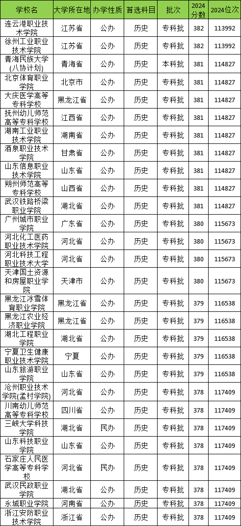 可以看到,2024年河北省高考380分左右的历史类考生可以报考徐州工业职业技术学院382分、青海民族大学(八协计划)381分、大庆医学高等专科学校381分等。