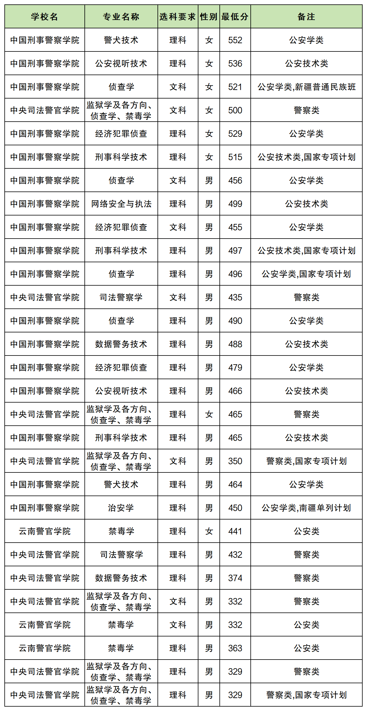 在男生方面,分数线最低的本科警校是中国人民警察大学(499分)。