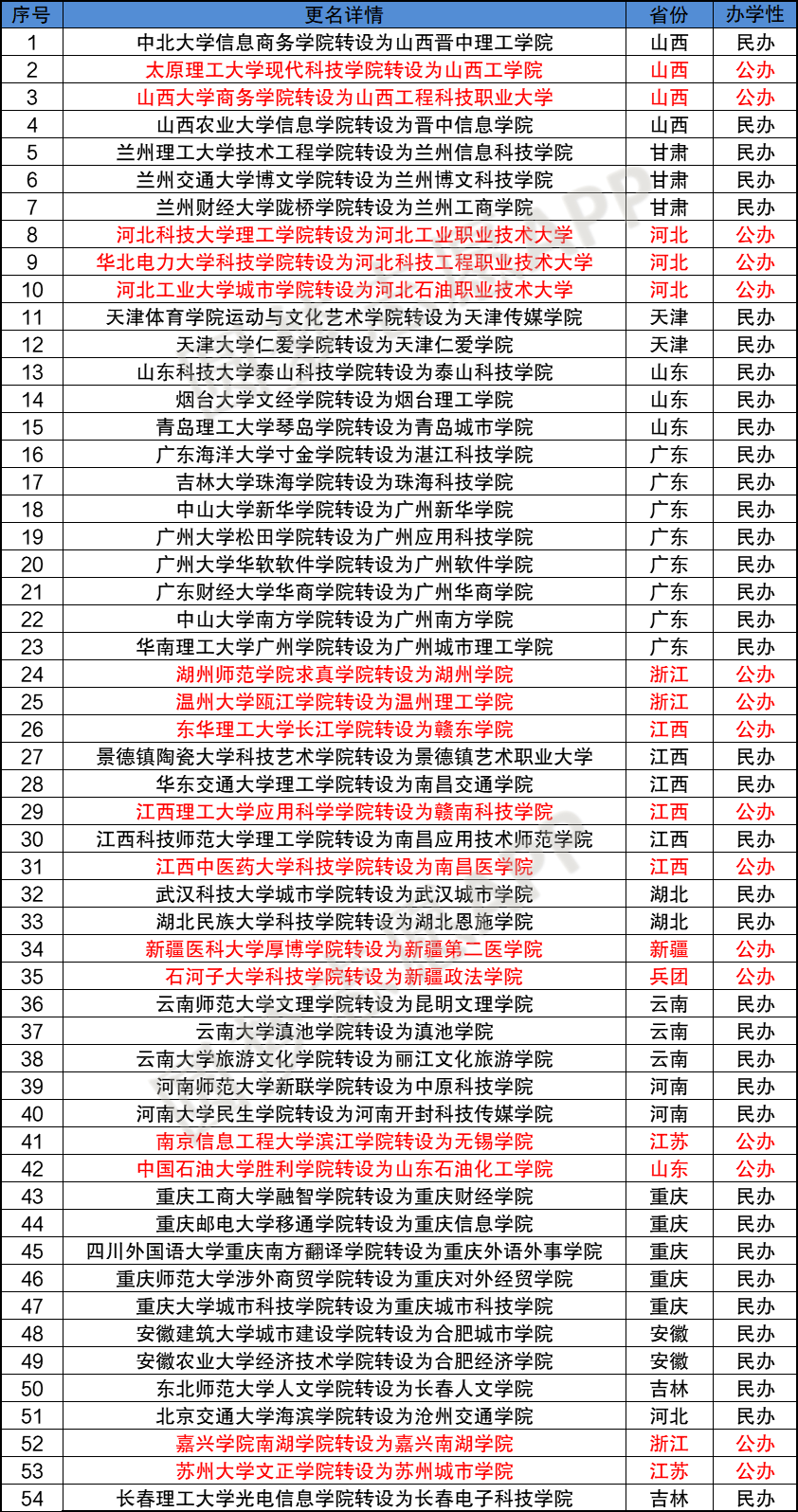 2020年教育部多次公示了高校更名的情况,不过这些高校大多为独立学院转设更名,以下为具体名单:
