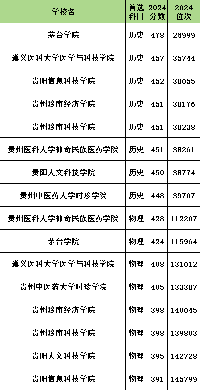 贵州省内最难考的民办本科是茅台学院,2024年历史类最低分478分、物理类最低分424分。