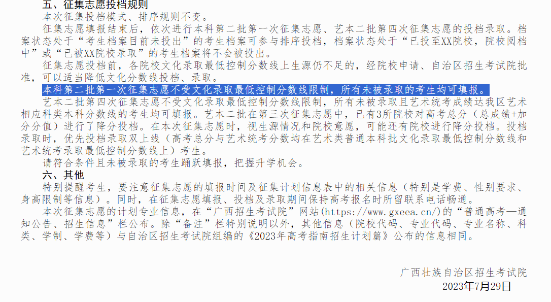 以2023年广西本科第二批第1、2、3次征集志愿填报规则为例,在填报本科第二批第1、2、3次征集志愿时均将不受文化录取最低控制分数线限制。所有未被录取的考生均可填报。(但在投档录取时,最低控制分数线上考生优先投档录取)