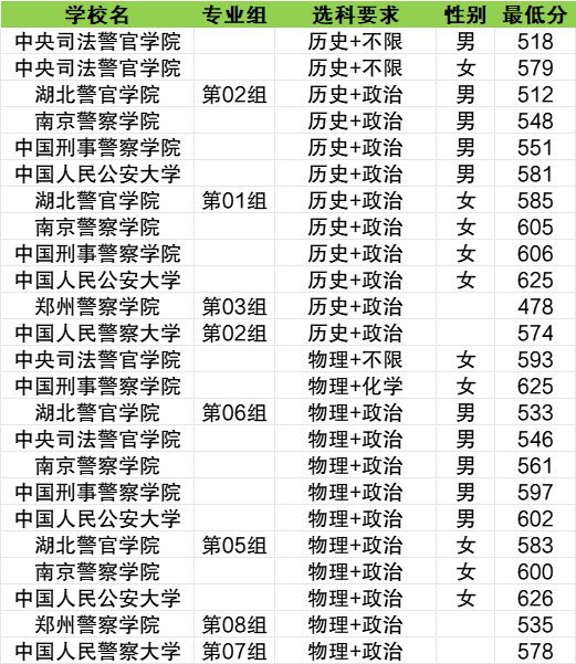 历史类招生分数均在478分及以上,女生最低分为579分(中央司法警官学院);男生最低分为512分(湖北警官学院),对应招生专业组为02专业组。