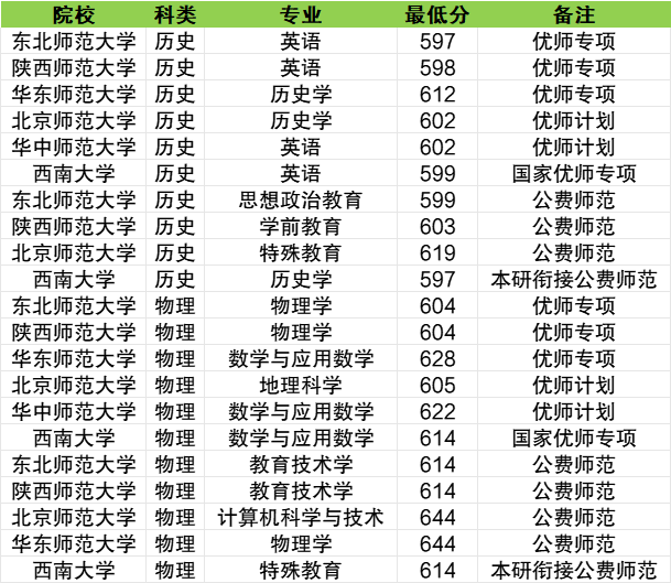 2024公费师范生院校最低录取分数及专业组可见下表: