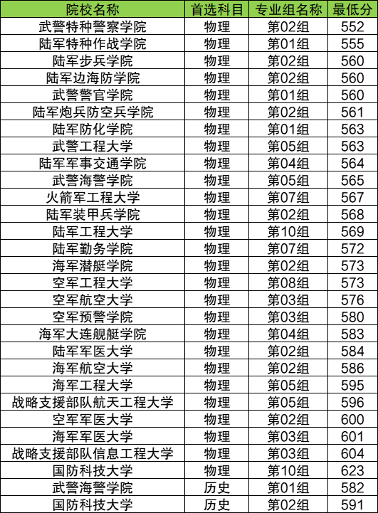 历史类招生分数均在582分及以上,最高分为637分(国防科技大学),对应招生专业组为03专业组;最低分为582分(武警海警学院),对应招生专业组为01专业组;