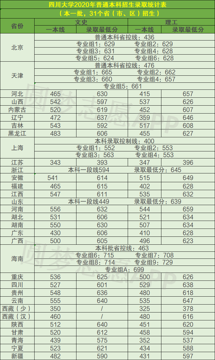 从上文中老师整理的数据可以看到,对于四川省的同学们来说,文科成绩在610分以上,理科成绩在640分以上,报考四川大学会相对稳妥一些;对于河南省的同学们来说,文理科成绩在640分左右,进入川大的可能性会比较大。
