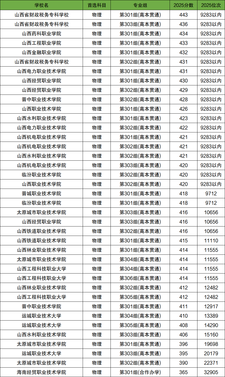 2025年山西3+2专本连读的高职院校在物理类的录取分数线在365分-443分之间,录取分数线最高的是山西省财政税务专科学校第301组(高本贯通),2025年最低分为443分;录取分数线最低的是海南经贸职业技术学院第301组(合作办学),2025年最低分为365分。