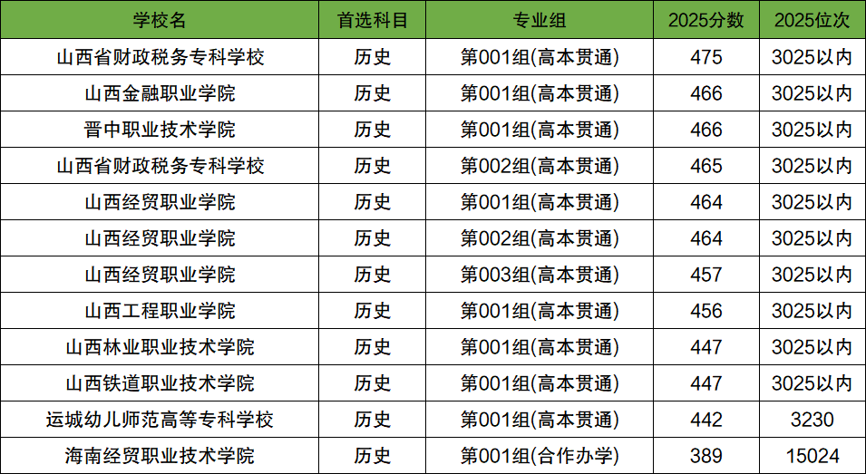从圆梦志愿查询的数据来看,2025年山西3+2专本连读的高职院校历史类最低录取分数线在389分-475分之间,录取分数线最高的是山西省财政税务专科学校第001组(高本贯通),2025年最低分为475分;录取分数线最低的是海南经贸职业技术学院第001组(合作办学),2025年最低分为389分。
