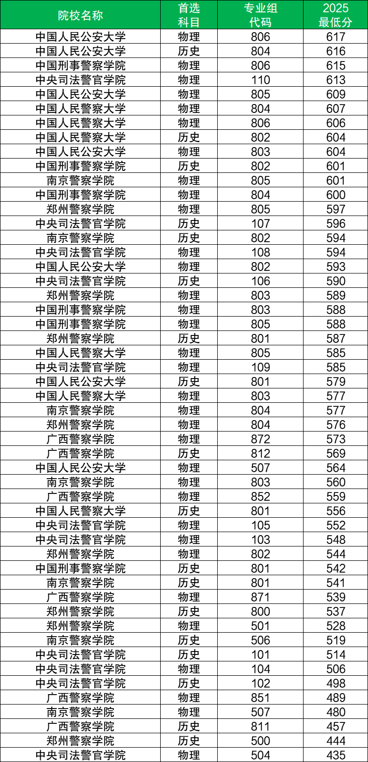 广西2025年警校物理类公布的投档线在435分-617分之间,考生最低需超本科批线65分(即435分)以上才有机会能被录取,如中央司法警官学院(专业组504)。而分数门槛最高的是中国人民公安大学(专业组806),2025年最低需617分才能报考,超本科批线247分。
