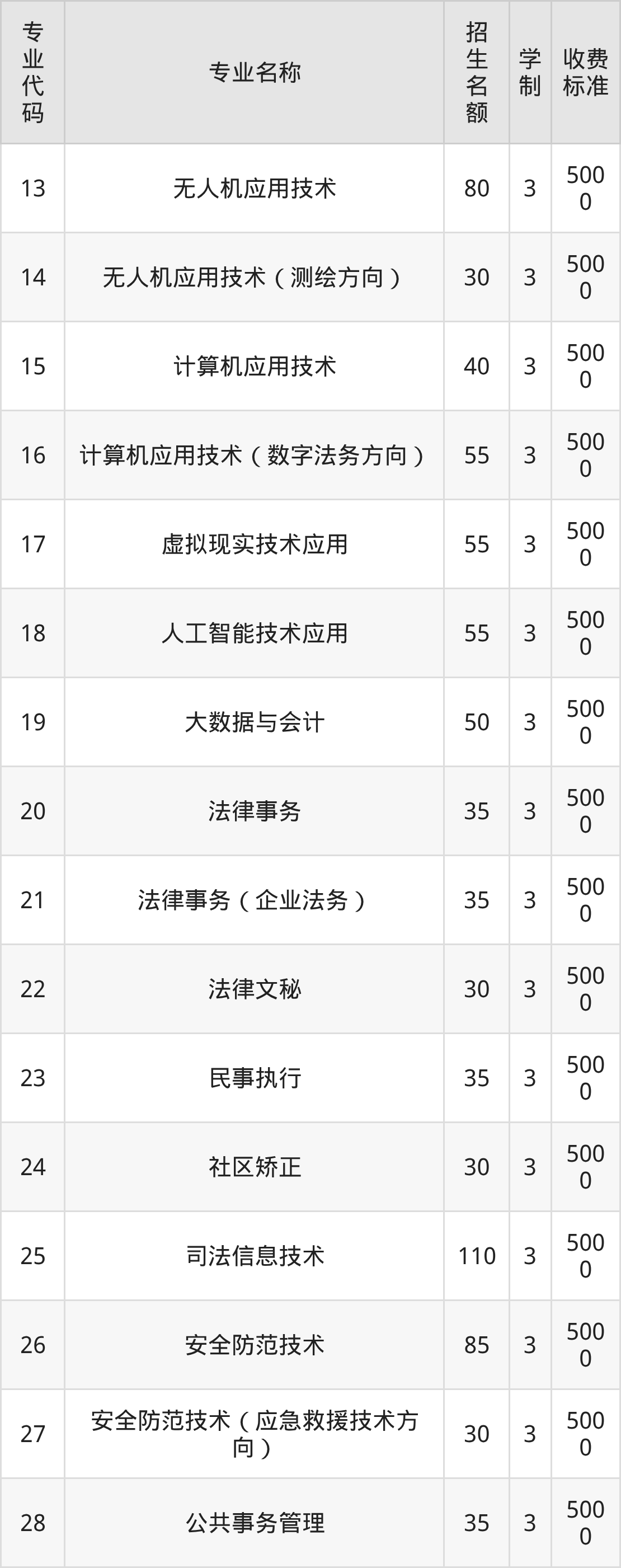 河北司法警官职业学院无人机应用技术专业在专科批历史类招80人,学制3年,专业招生代码是13,学费是5000元一年。河北司法警官职业学院无人机应用技术专业在专科批历史类招30人,学制3年,专业招生代码是14,学费是5000元一年。