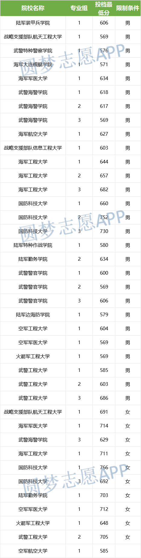 1)陆军勤务学院(女生,1组),最低录取分数线703分;