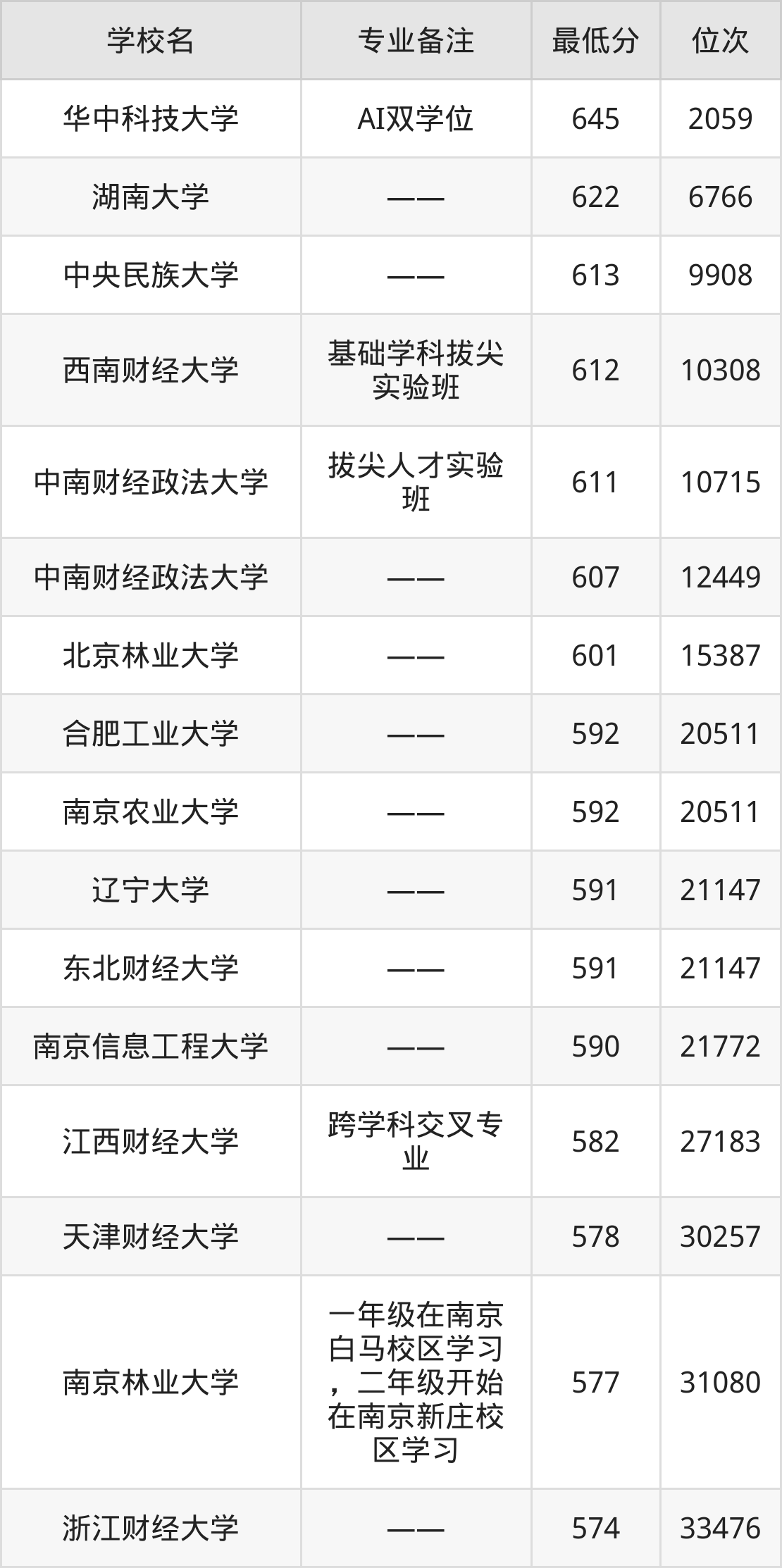 数字经济分数线排名前五的院校分别是:645分的华中科技大学(AI双学位)、622分的湖南大学、613分的中央民族大学、612分的西南财经大学(基础学科拔尖实验班)、611分的中南财经政法大学(拔尖人才实验班)。
