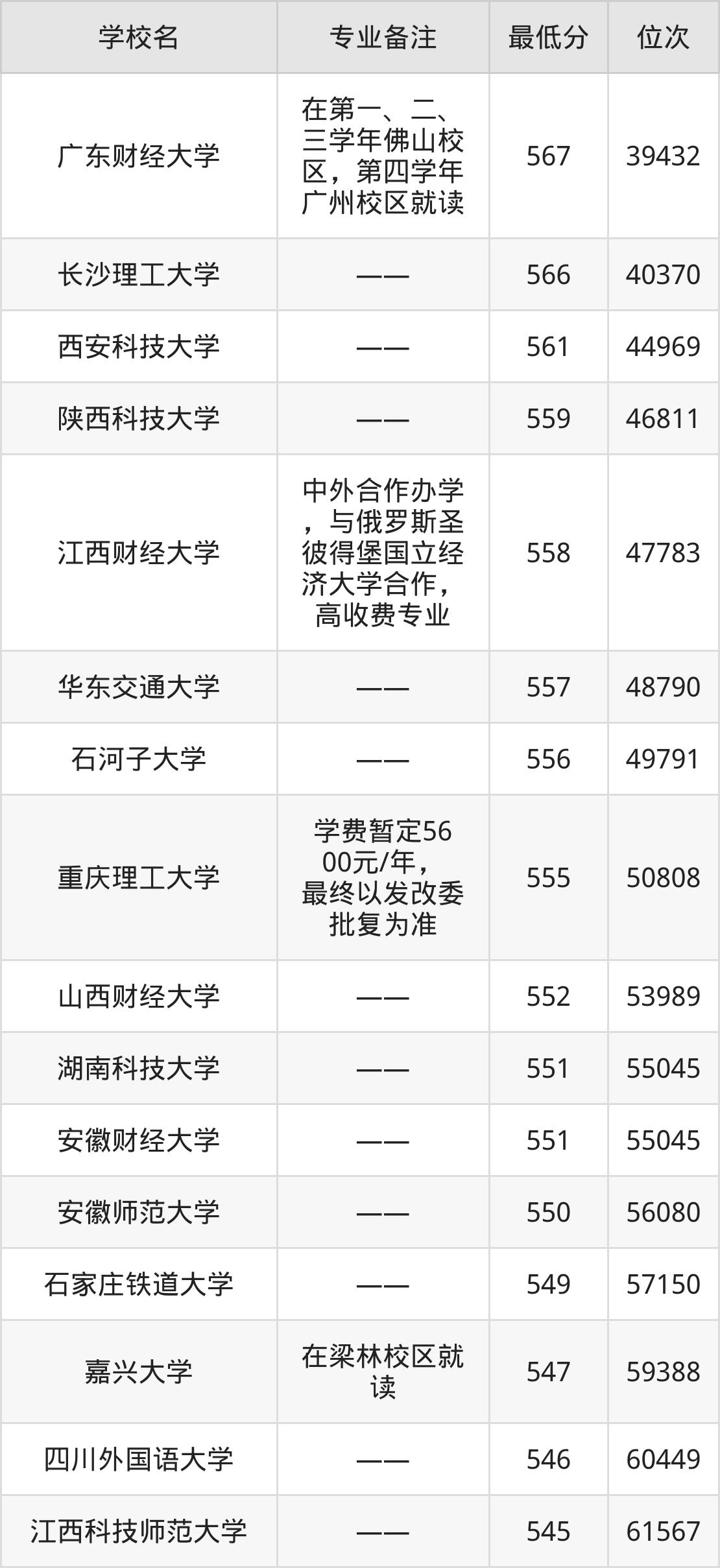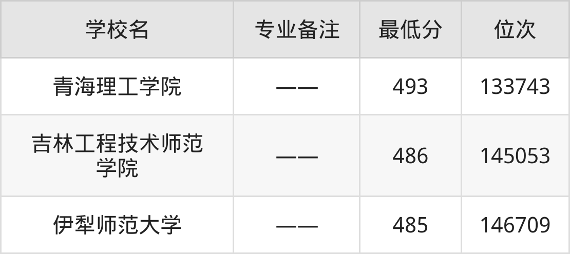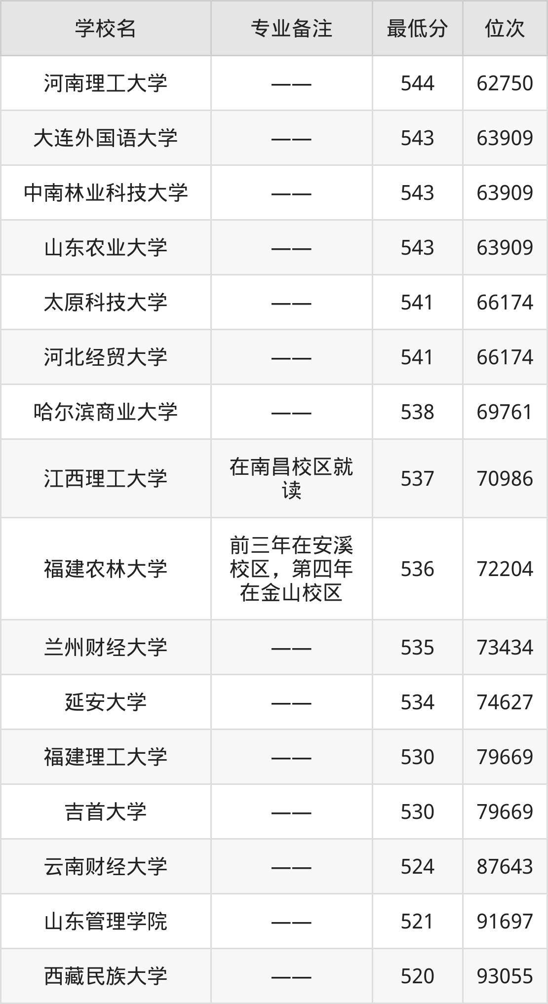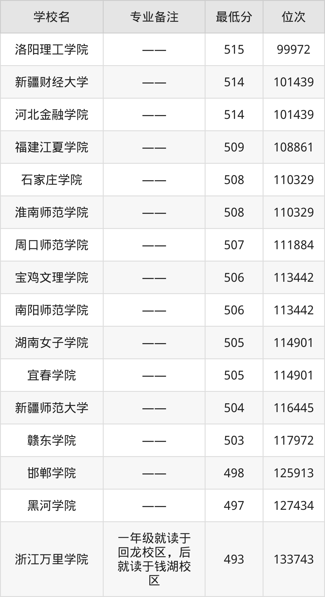 分数线低于500分能上的数字经济大学还有黑河学院(497分)、浙江万里学院(493分)、青海理工学院(493分)、吉林工程技术师范学院(486分)。