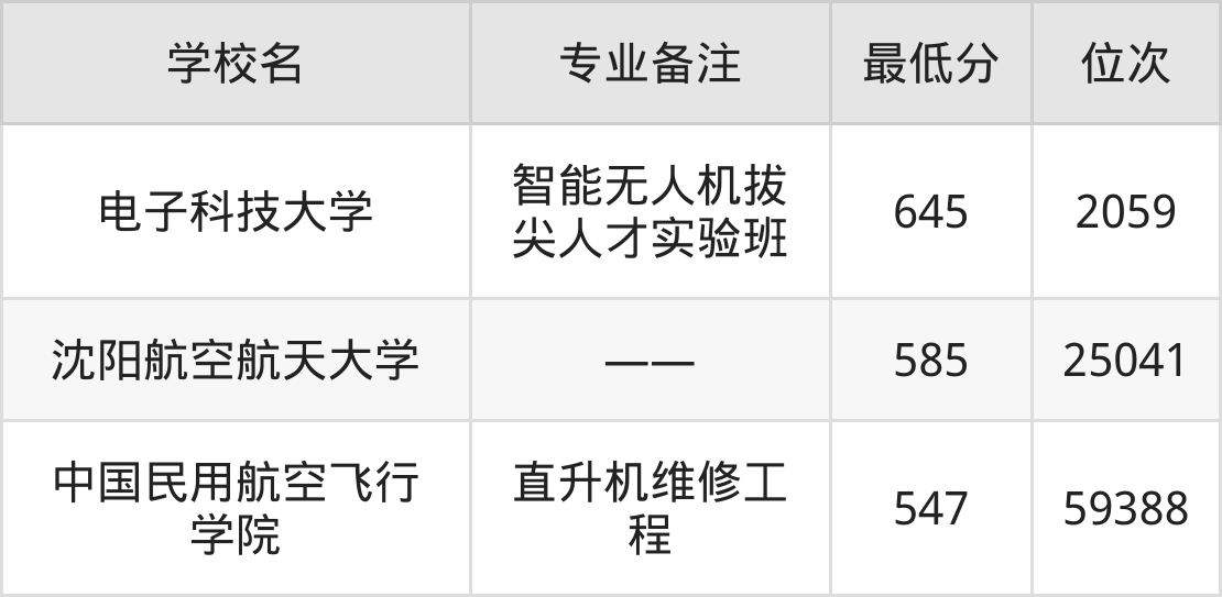 航空航天工程分数线排名前三的院校分别是:645分的电子科技大学(智能无人机拔尖人才实验班)、585分的沈阳航空航天大学、547分的中国民用航空飞行学院(直升机维修工程)。