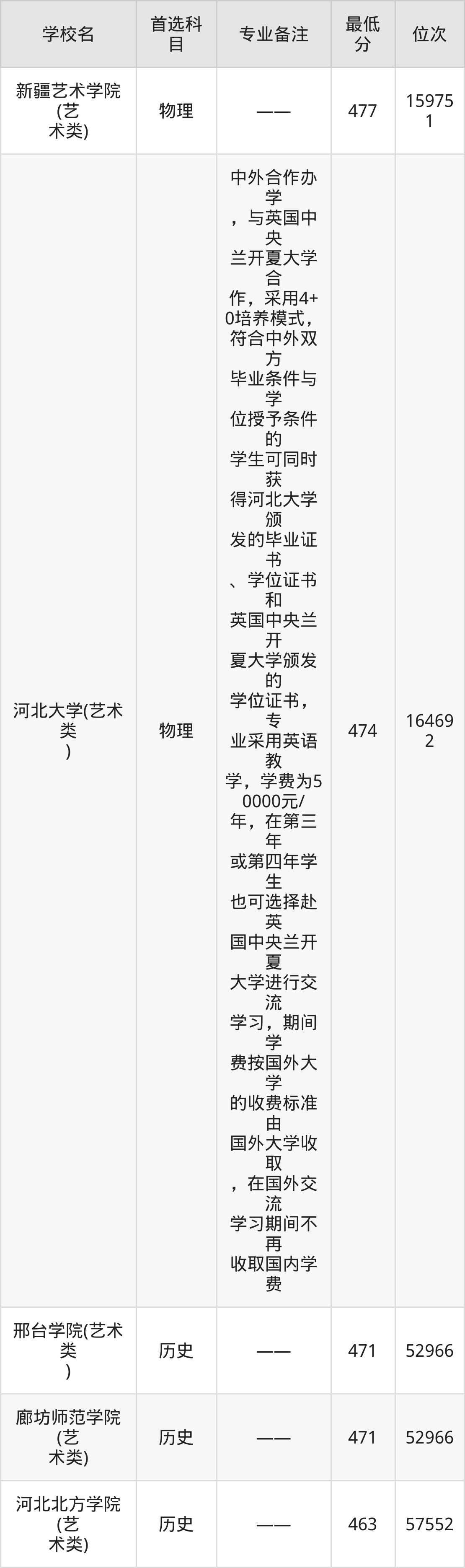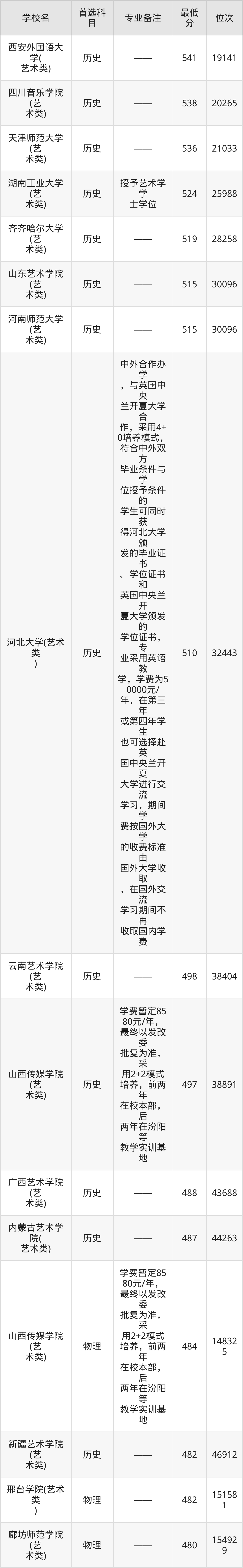 分数线低于480分能上的戏剧影视文学大学还有新疆艺术学院(艺术类)(477分)、河北大学(艺术类)(474分)、邢台学院(艺术类)(471分)、廊坊师范学院(艺术类)(471分)。