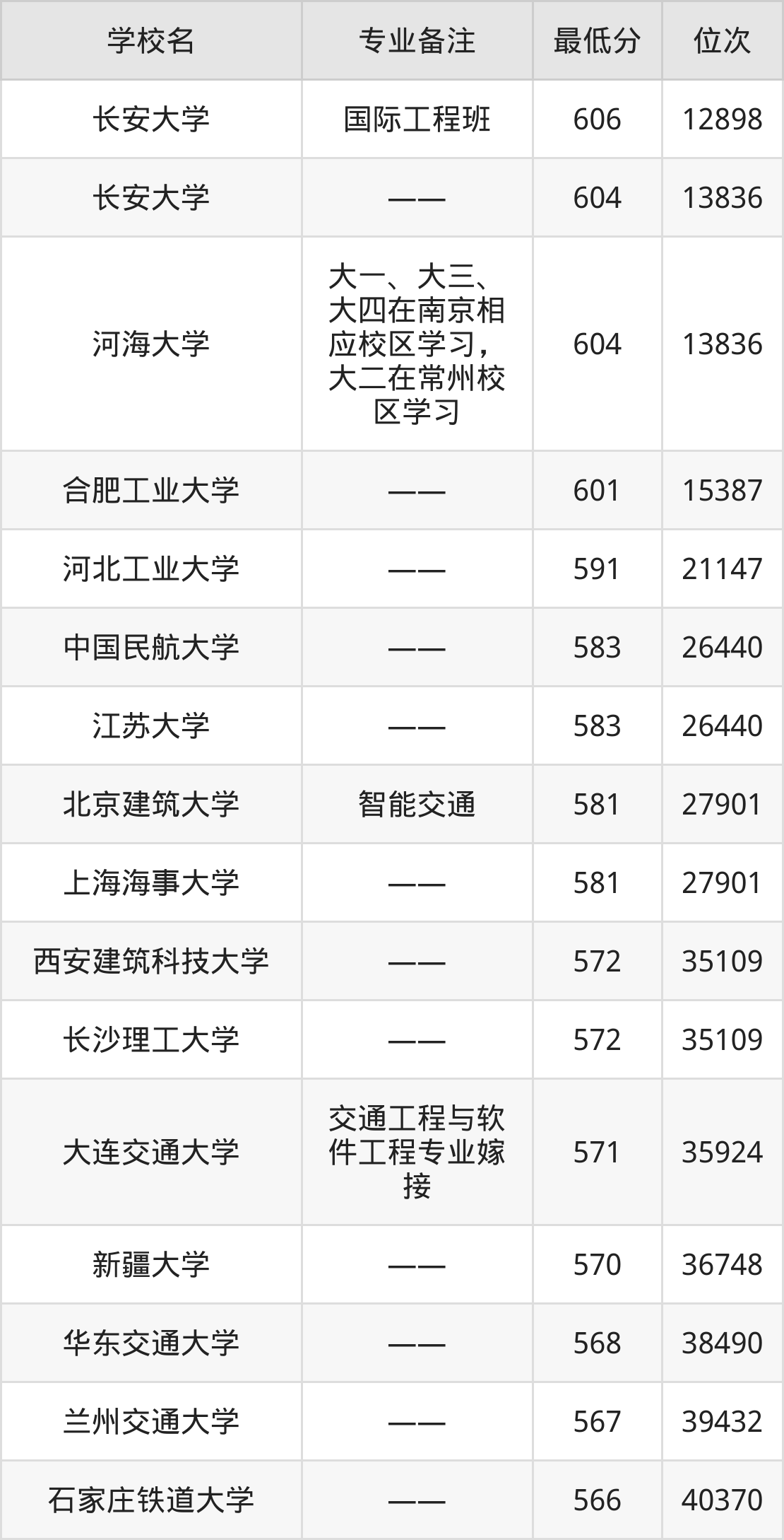 600分左右的交通工程大学有:合肥工业大学601分、长安大学604分、河海大学604分、长安大学606分。