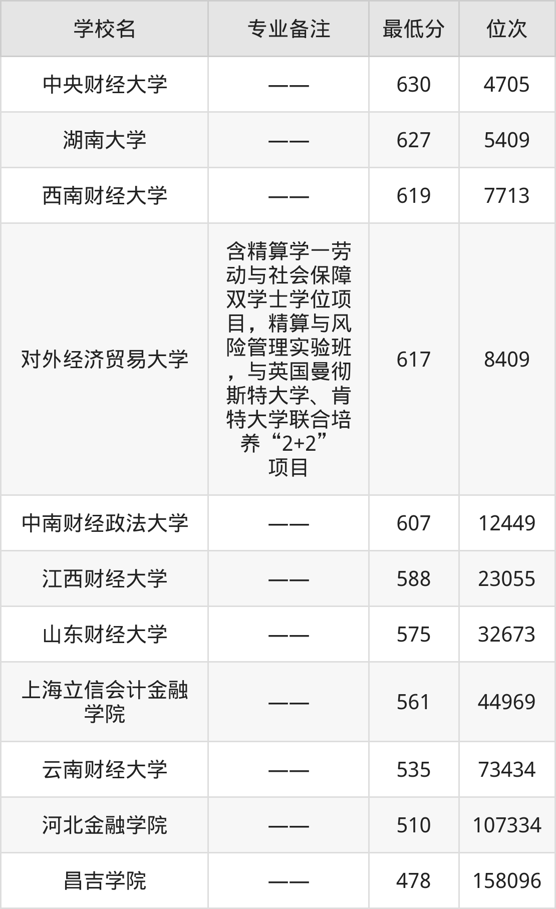 分数线低于580分能上的精算学大学还有山东财经大学(575分)、上海立信会计金融学院(561分)、云南财经大学(535分)、河北金融学院(510分)。