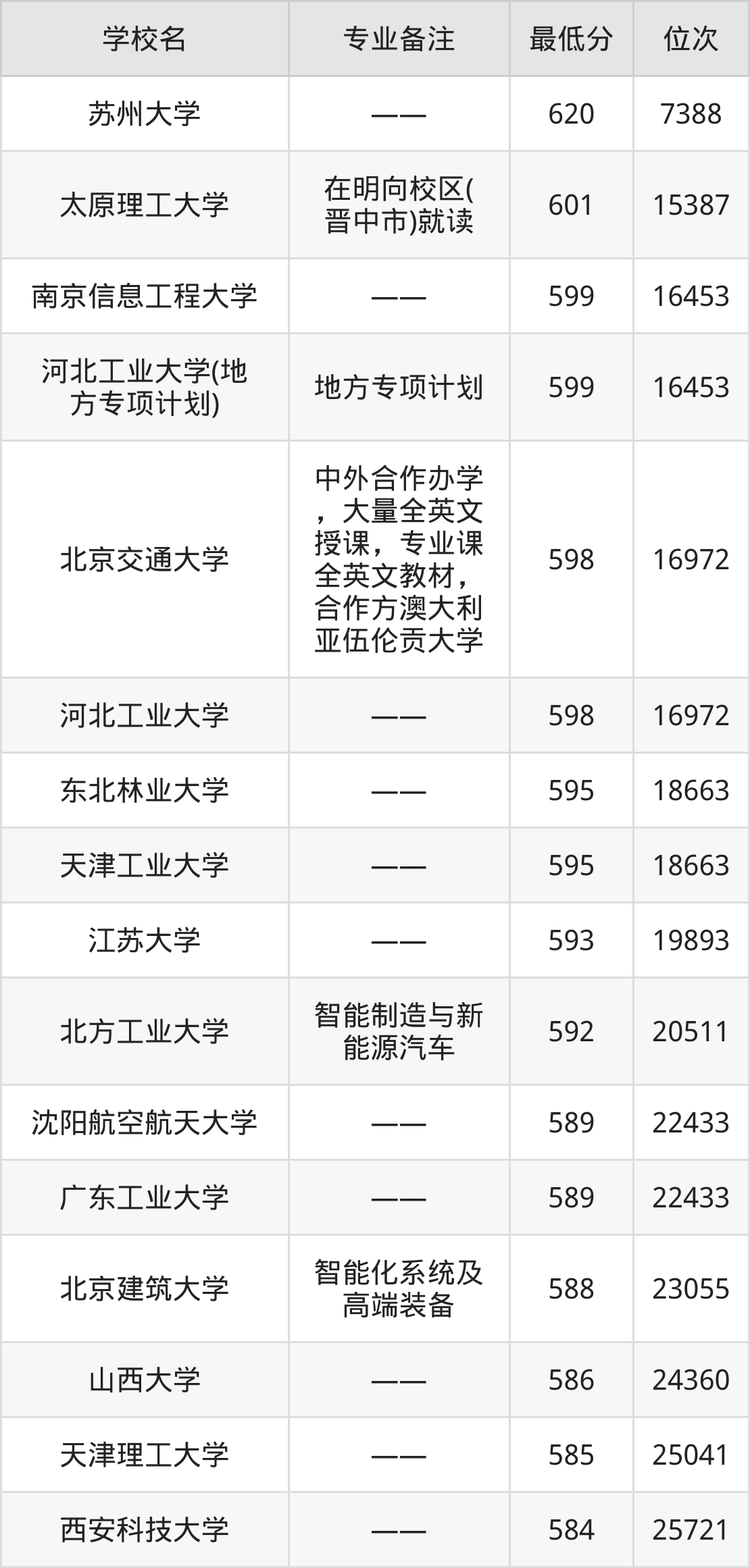 600分左右的机械电子工程大学有:太原理工大学601分、南京信息工程大学599分、河北工业大学(地方专项计划)599分、北京交通大学598分。