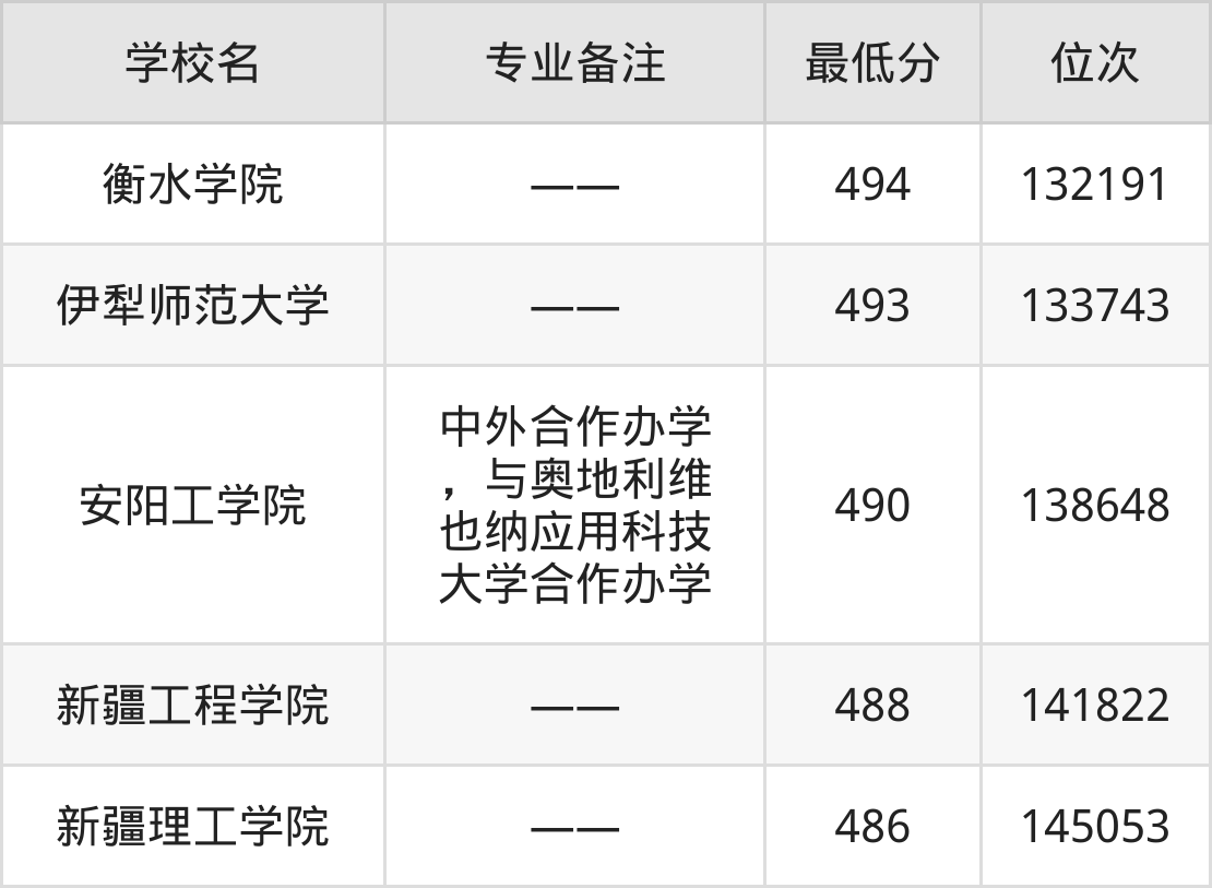 分数线低于500分能上的机械电子工程大学还有衡水学院(494分)、伊犁师范大学(493分)、安阳工学院(490分)、新疆工程学院(488分)。