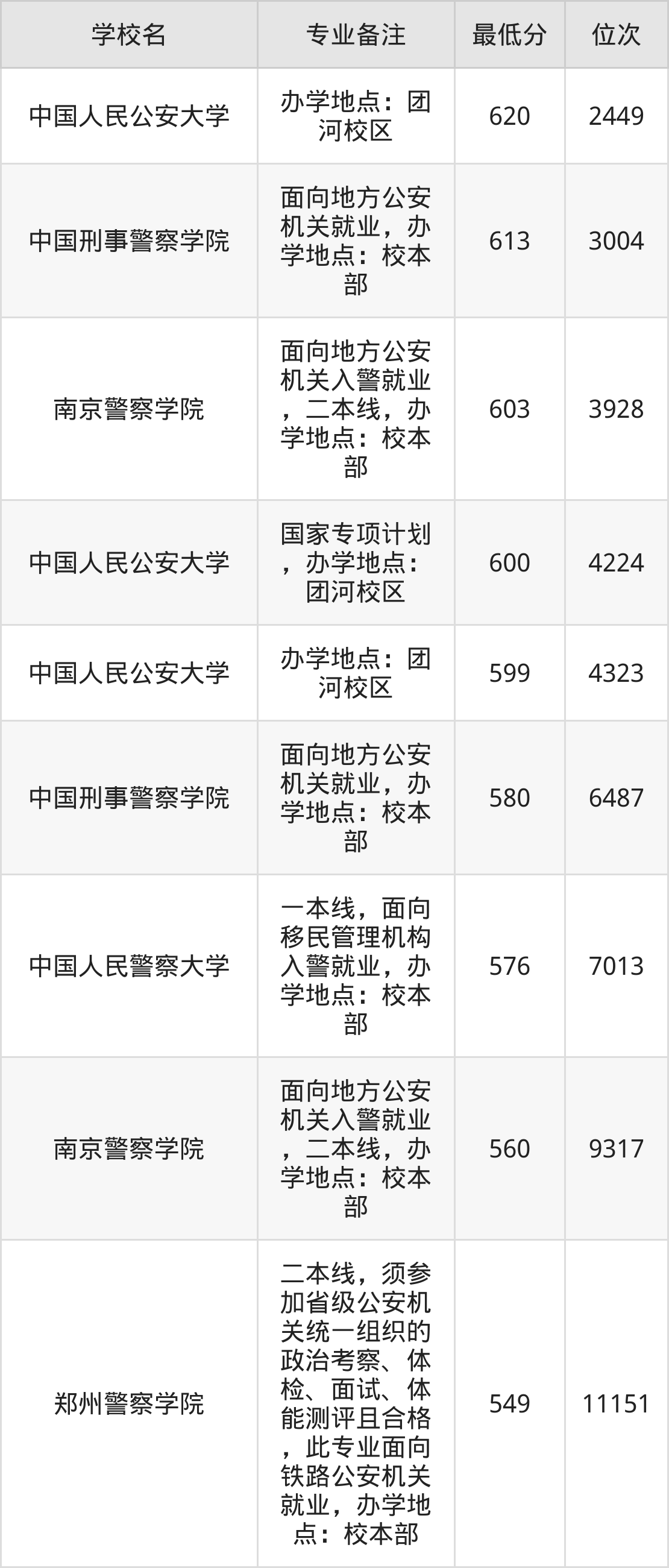 院校举例:中国人民公安大学、中国人民警察大学、中国刑事警察学院、南京警察学院、郑州警察学院、云南警官学院、甘肃政法大学、新疆警察学院。