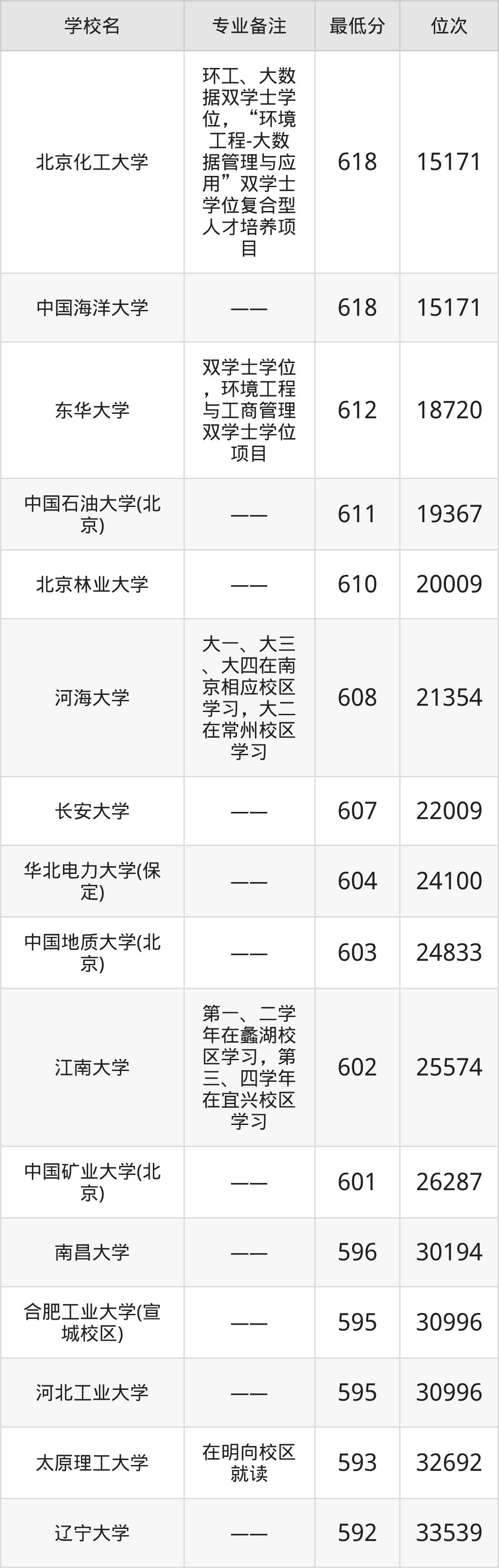 600分左右的环境工程大学有:中国矿业大学(北京)601分、江南大学602分、中国地质大学(北京)603分、华北电力大学(保定)604分。