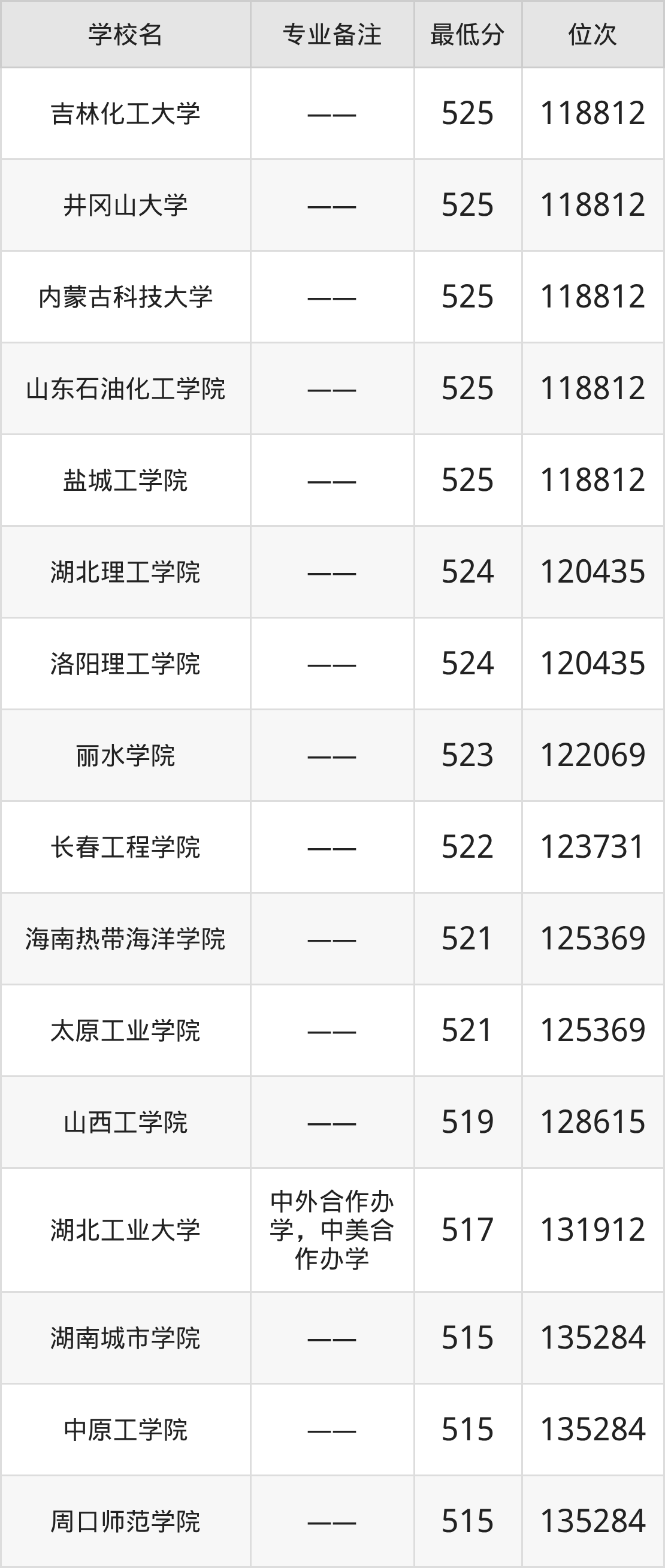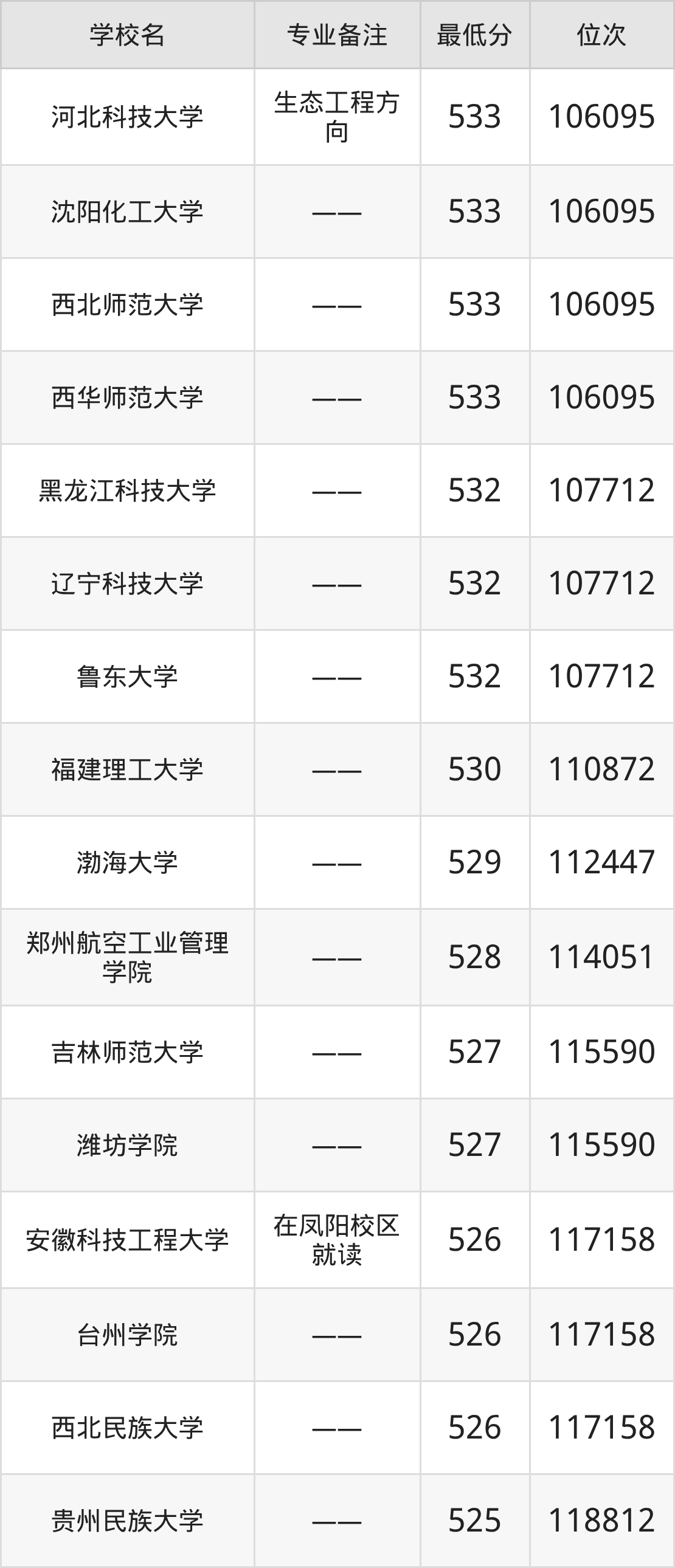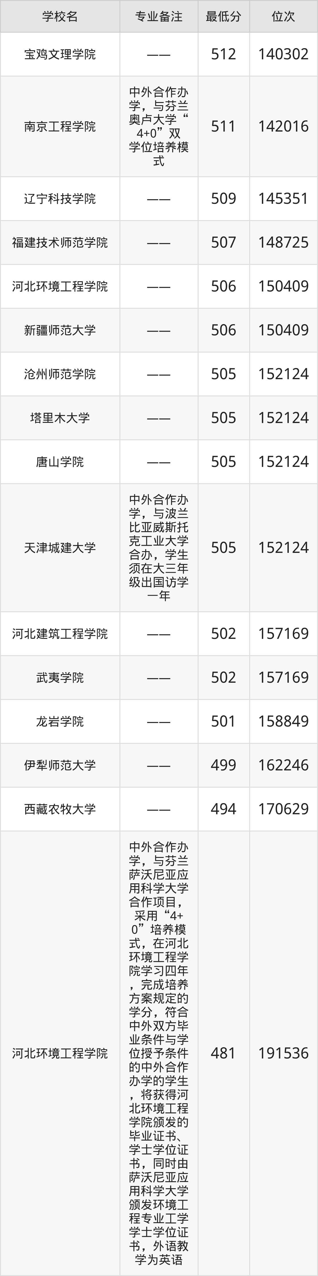 分数线低于510分能上的环境工程大学还有龙岩学院(501分)、伊犁师范大学(499分)、西藏农牧大学(494分)、河北环境工程学院(481分)。