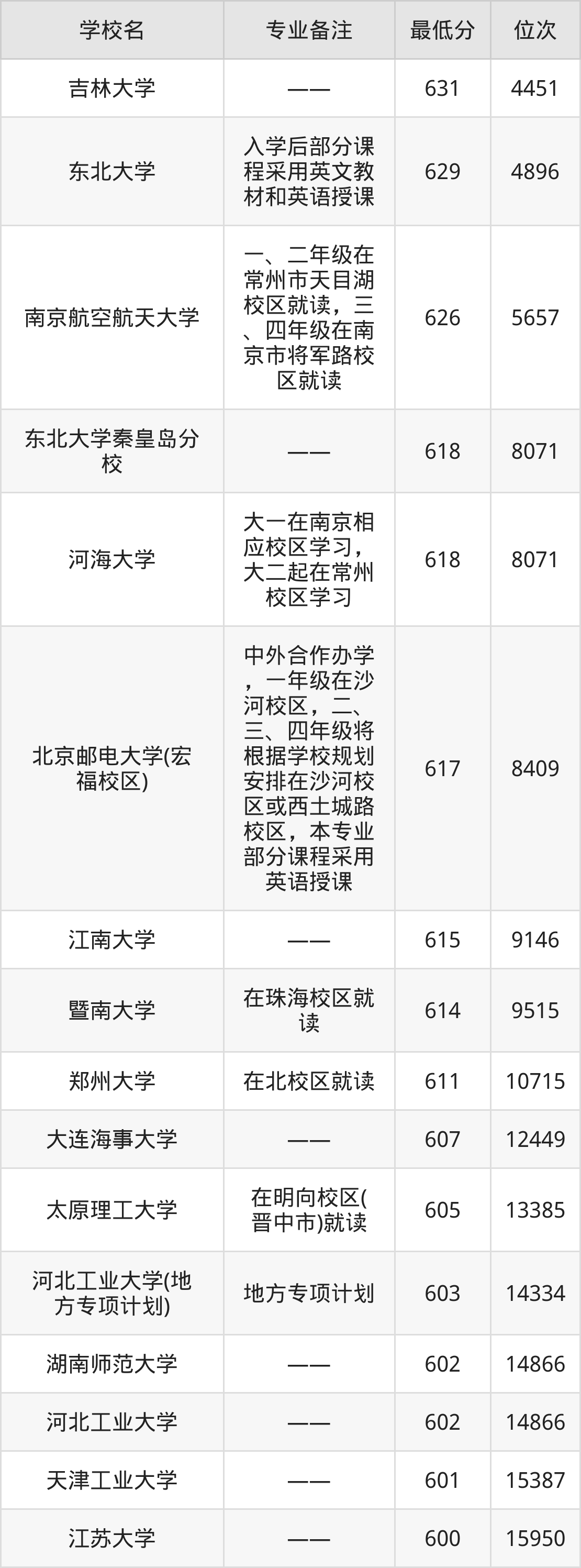 物联网工程分数线排名前五的院校分别是:631分的吉林大学、629分的东北大学(入学后部分课程采用英文教材和英语授课)、626分的南京航空航天大学(一、二年级在常州市天目湖校区就读,三、四年级在南京市将军路校区就读)、618分的东北大学秦皇岛分校、618分的河海大学(大一在南京相应校区学习,大二起在常州校区学习)。