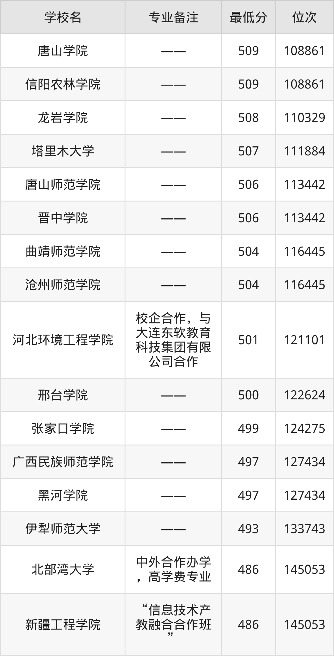 分数线低于500分能上的物联网工程大学还有黑河学院(497分)、伊犁师范大学(493分)、北部湾大学(486分)、新疆工程学院(486分)。