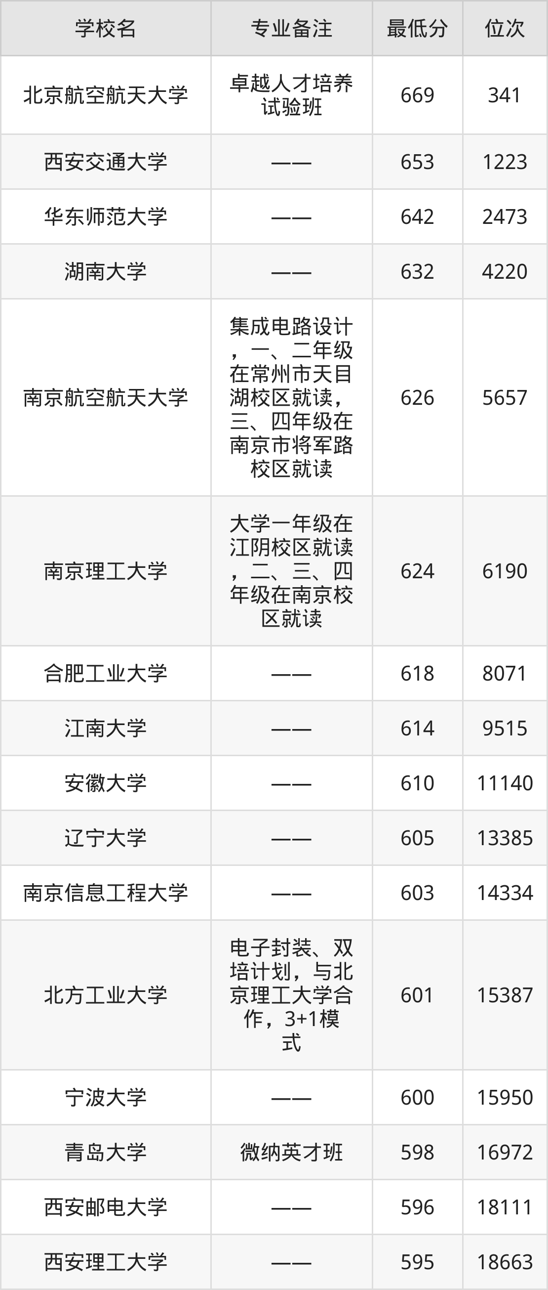 分数线低于550分能上的微电子科学与工程大学还有重庆文理学院(541分)、太原工业学院(532分)、丽水学院(529分)、北华航天工业学院(527分)。