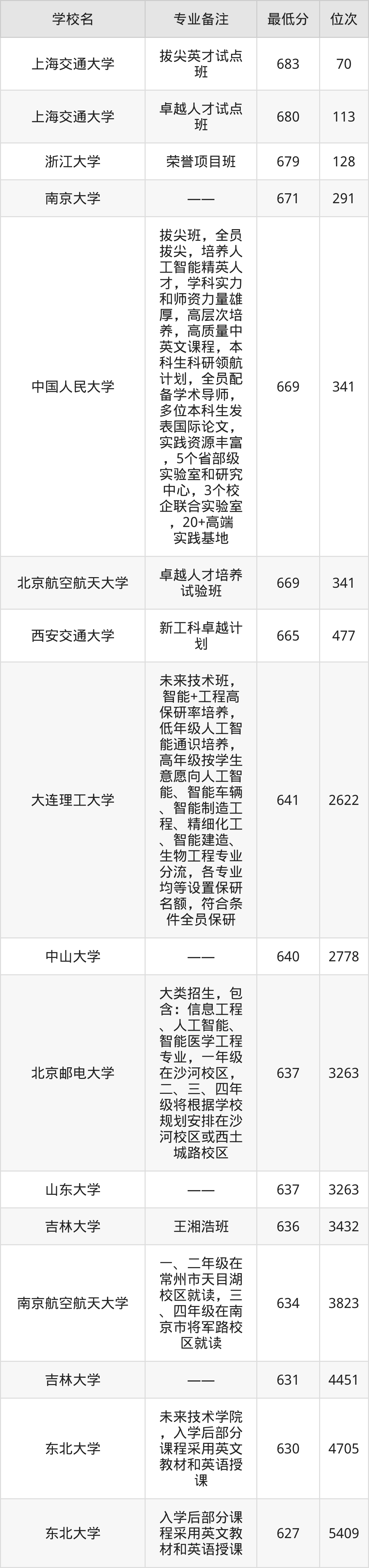 人工智能分数线排名前五的院校分别是:683分的上海交通大学(拔尖英才试点班)、679分的浙江大学(荣誉项目班)、671分的南京大学、669分的中国人民大学(拔尖班,全员拔尖,培养人工智能精英人才,学科实力和师资力量雄厚,高层次培养,高质量中英文课程,本科生科研领航计划,全员配备学术导师,多位本科生发表国际论文,实践资源丰富,5个省部级实验室和研究中心,3个校企联合实验室,20+高端实践基地)、669分的北京航空航天大学(卓越人才培养试验班)。