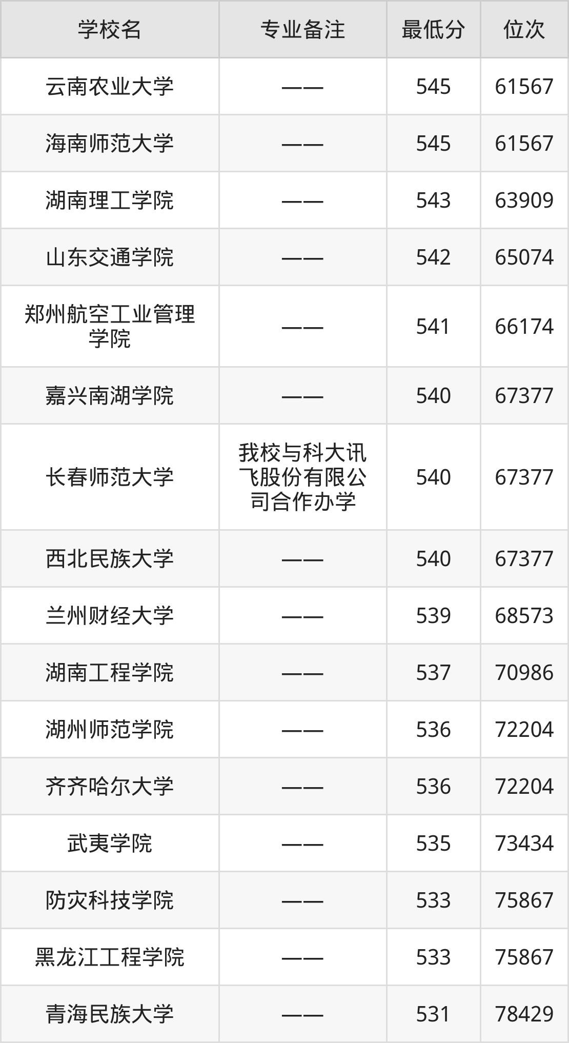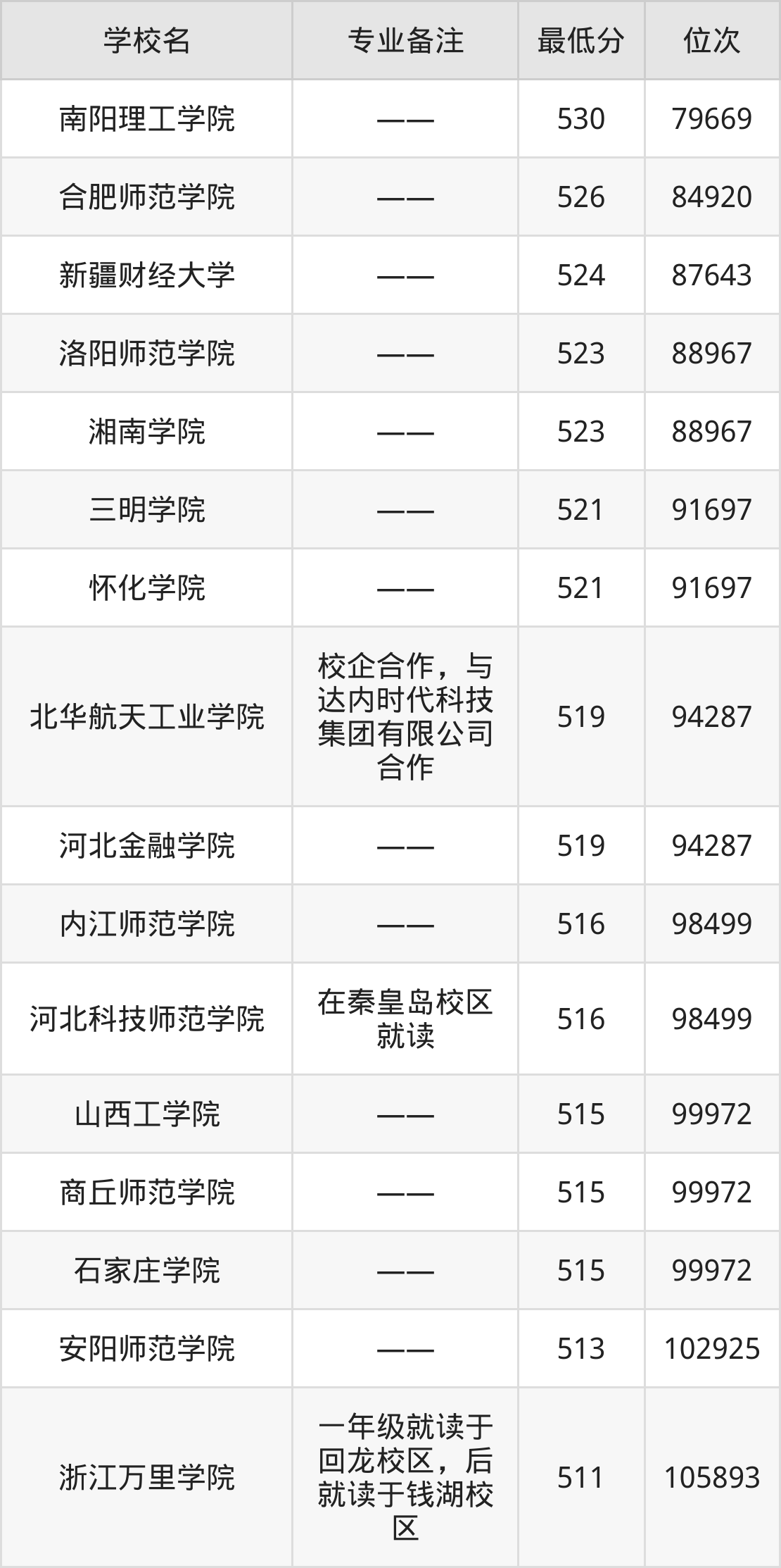 分数线低于510分能上的人工智能大学还有邯郸学院(503分)、河西学院(502分)、贺州学院(502分)、吉林工程技术师范学院(499分)。