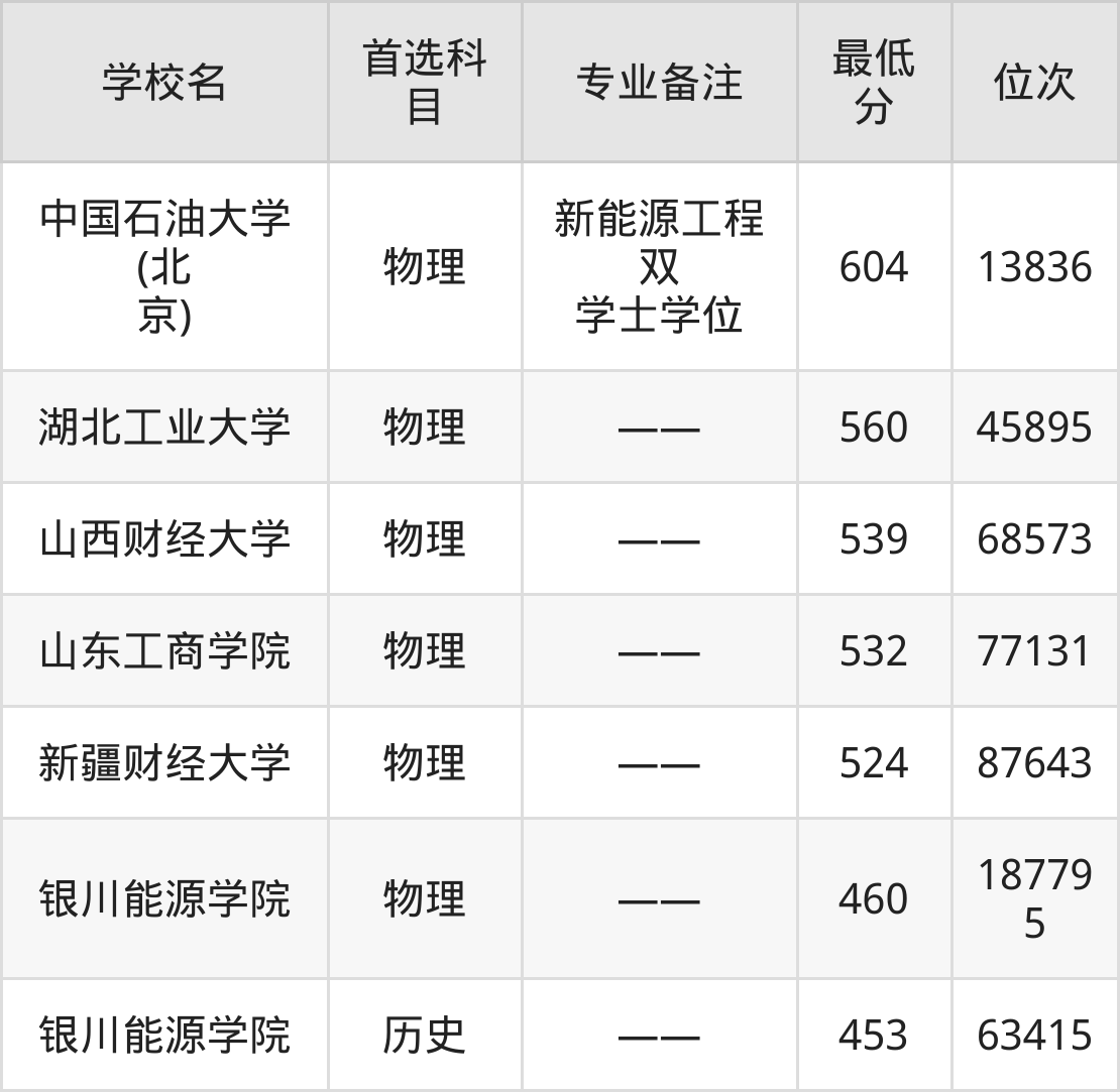 能源经济分数线排名前五的院校分别是:604分的中国石油大学(北京)(新能源工程双学士学位)、560分的湖北工业大学、539分的山西财经大学、532分的山东工商学院、524分的新疆财经大学。