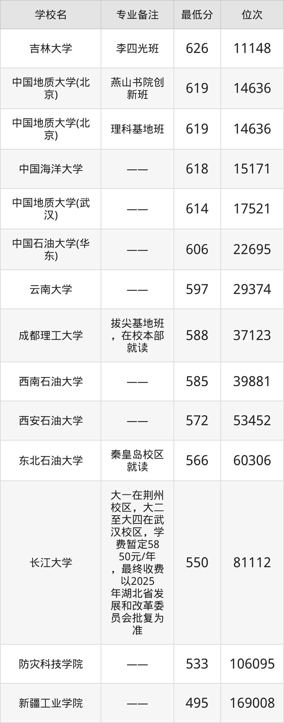 分数线低于580分能上的地质学大学还有西安石油大学(572分)、东北石油大学(566分)、长江大学(550分)、防灾科技学院(533分)。