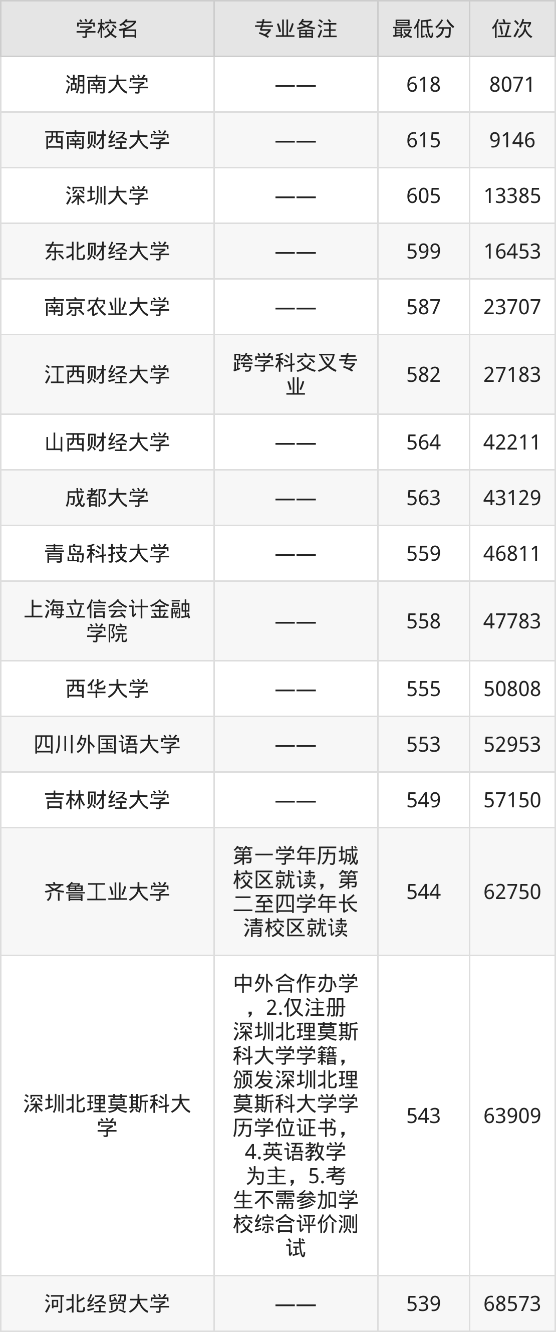 金融科技分数线排名前五的院校分别是:618分的湖南大学、615分的西南财经大学、605分的深圳大学、599分的东北财经大学、587分的南京农业大学。