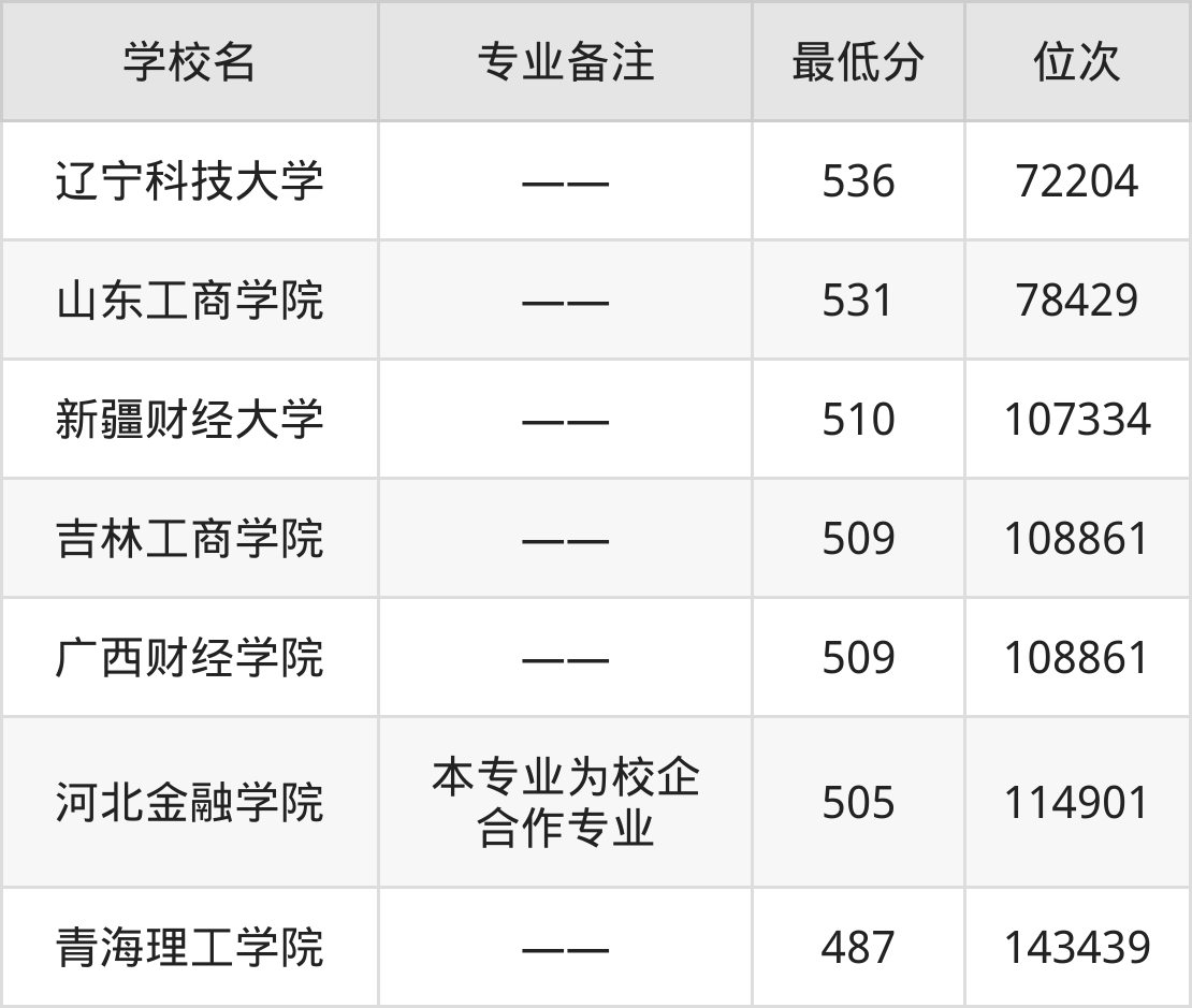 分数线低于510分能上的金融科技大学还有新疆财经大学(510分)、吉林工商学院(509分)、广西财经学院(509分)、河北金融学院(505分)。