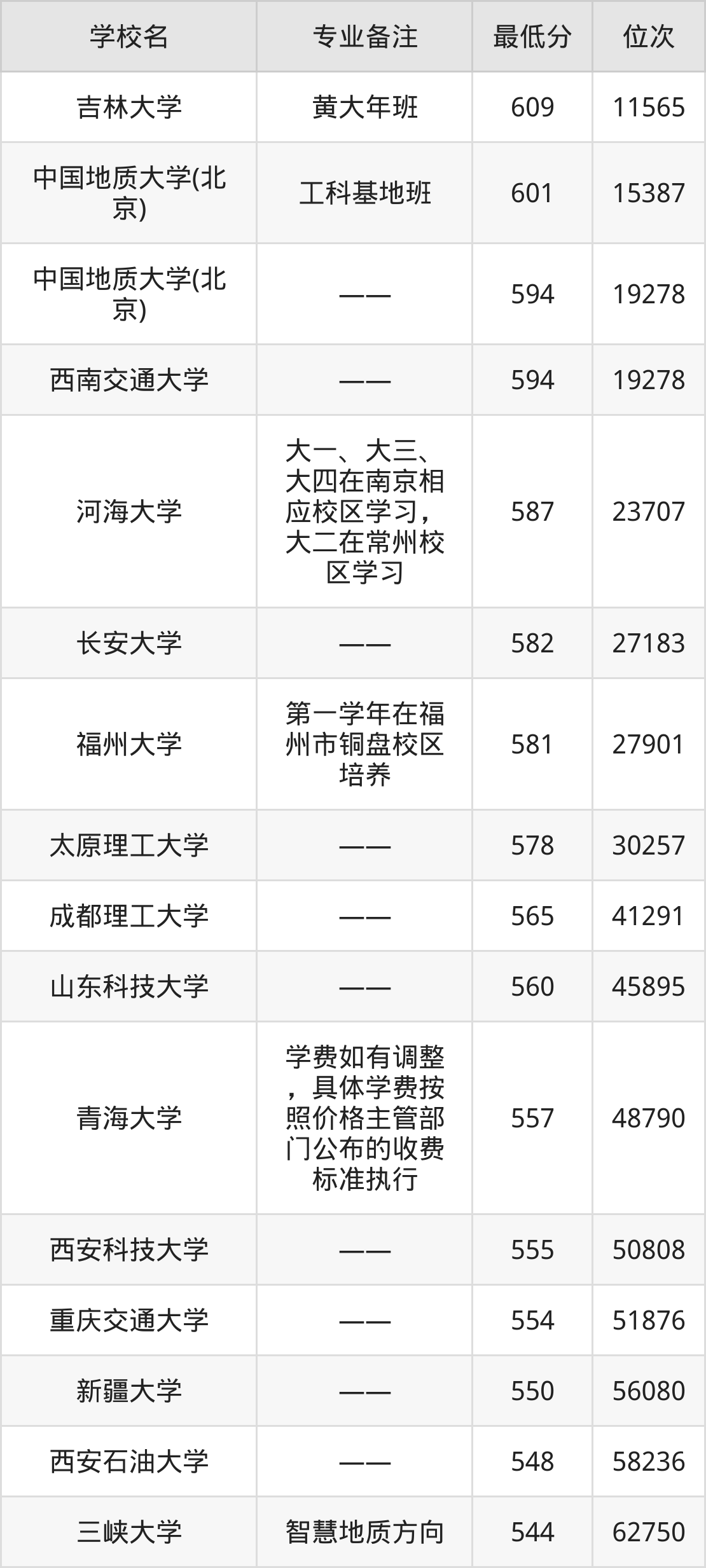 600分左右的地质工程大学有:中国地质大学(北京)601分、中国地质大学(北京)594分、西南交通大学594分、吉林大学609分。