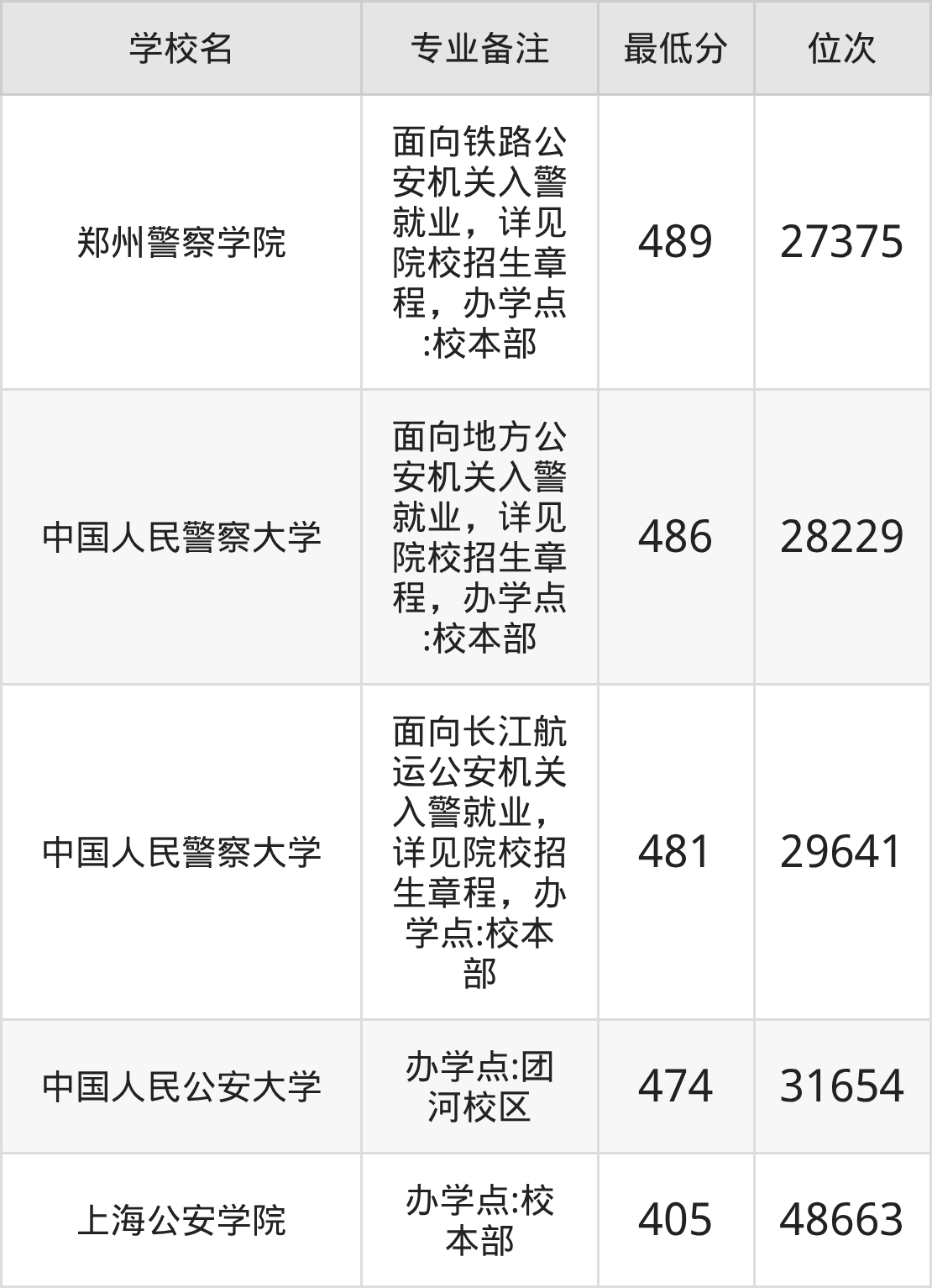院校举例:中国人民公安大学、中国人民警察大学、南京警察学院、郑州警察学院、新疆警察学院。
