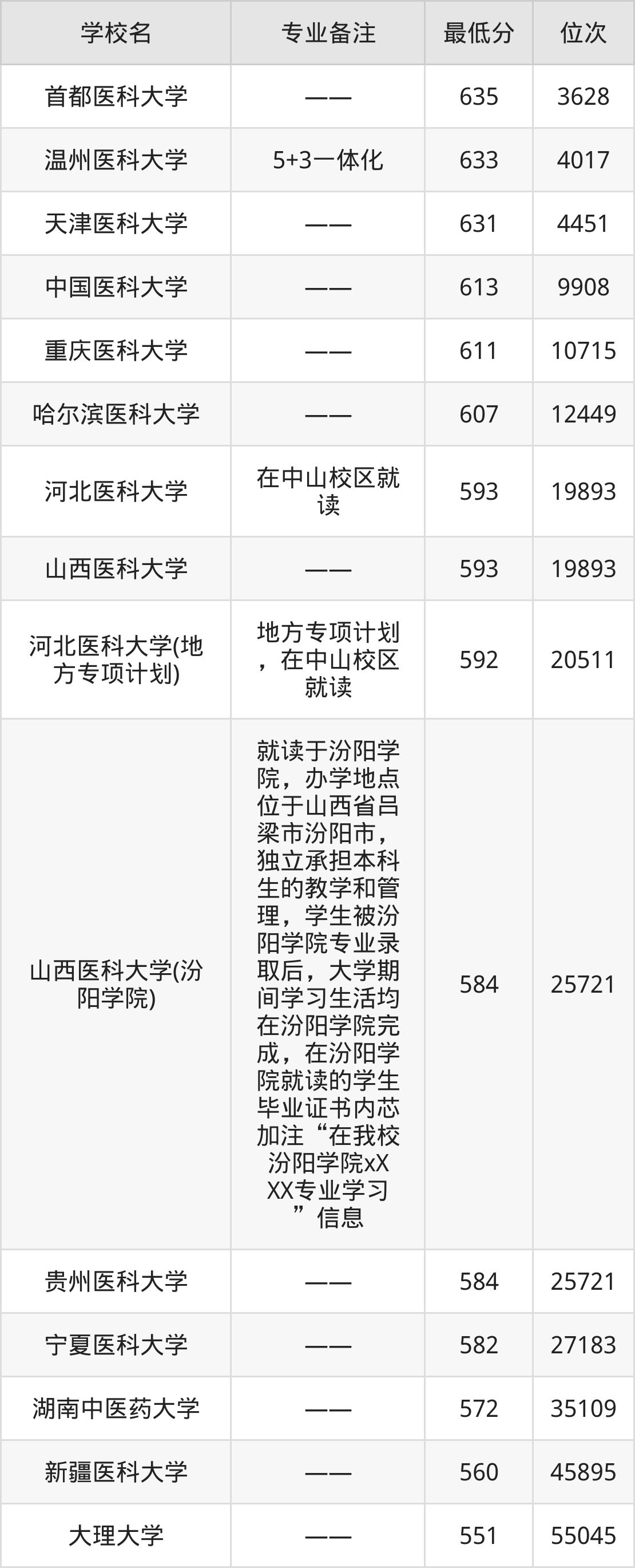 院校举例:天津医科大学、山西医科大学、哈尔滨医科大学、福建医科大学、新疆医科大学。
