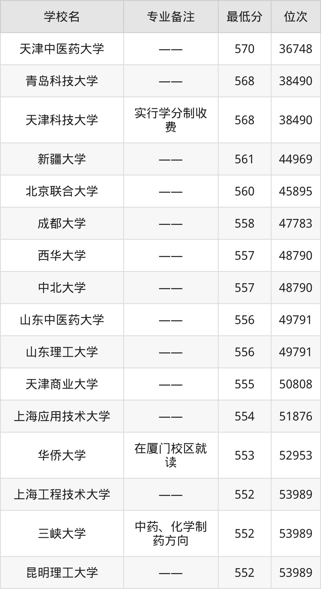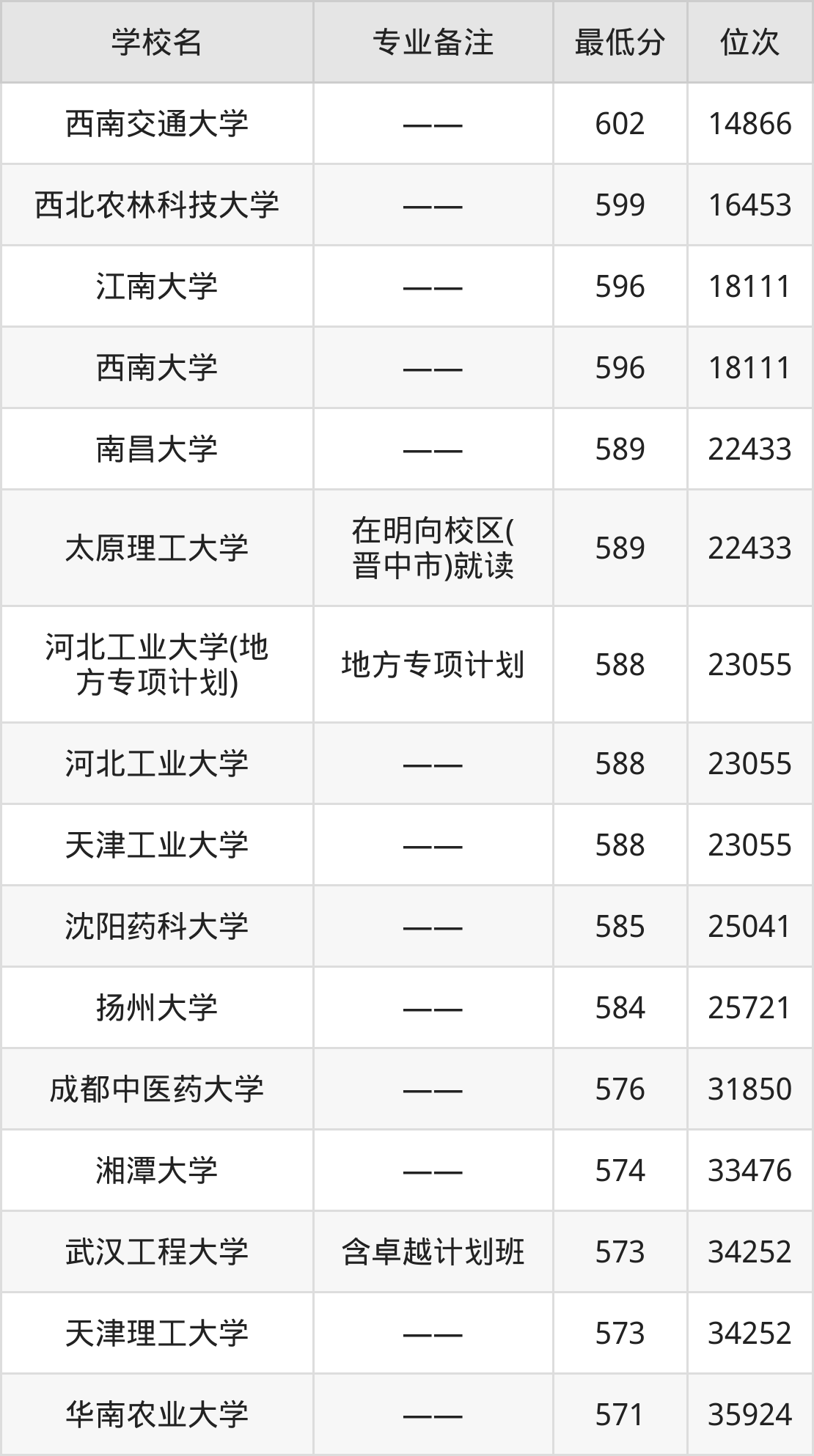 600分左右的制药工程大学有:西北农林科技大学599分、西南交通大学602分、江南大学596分、西南大学596分。