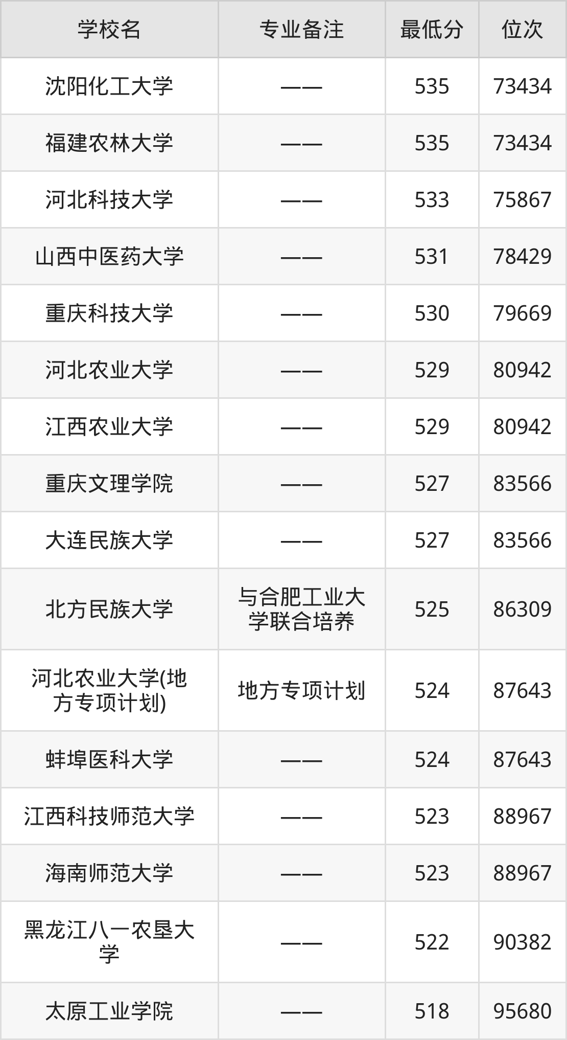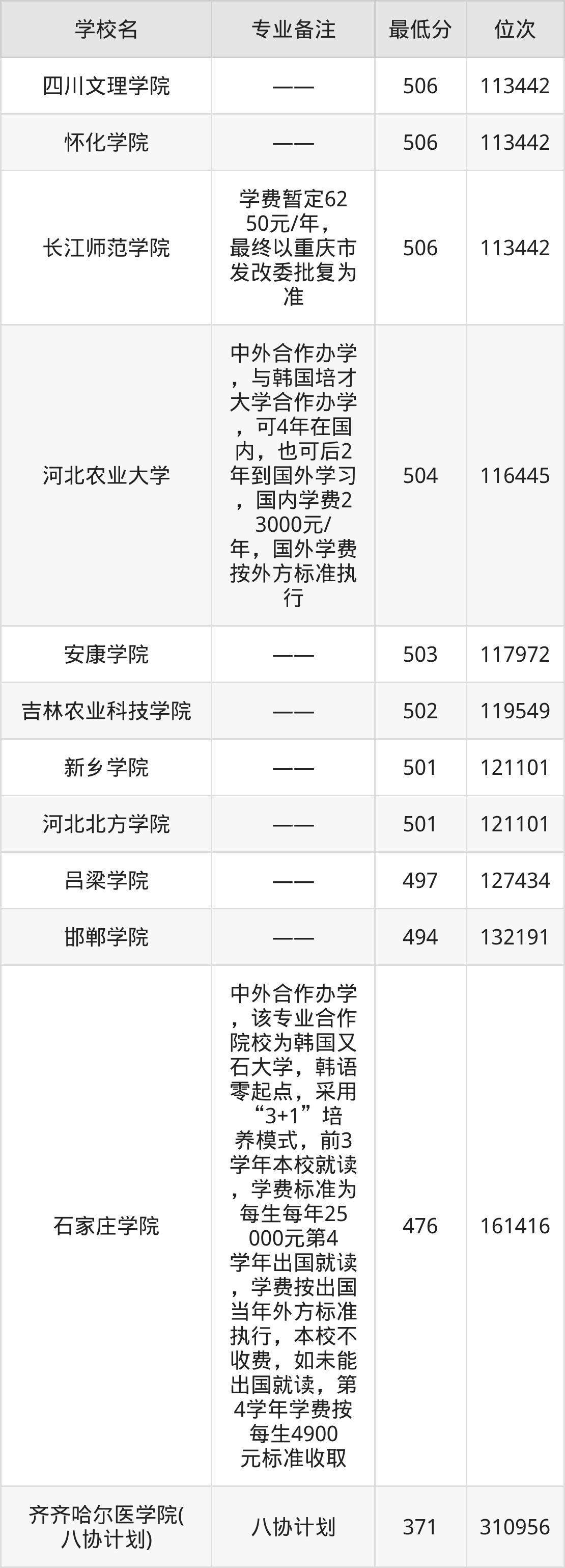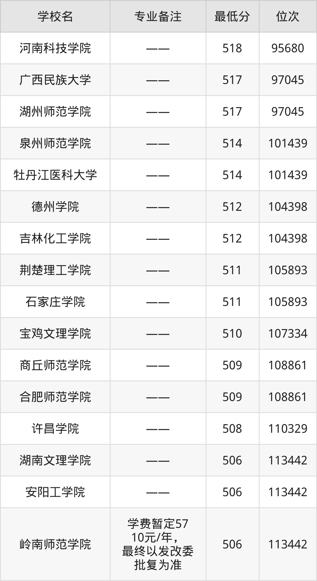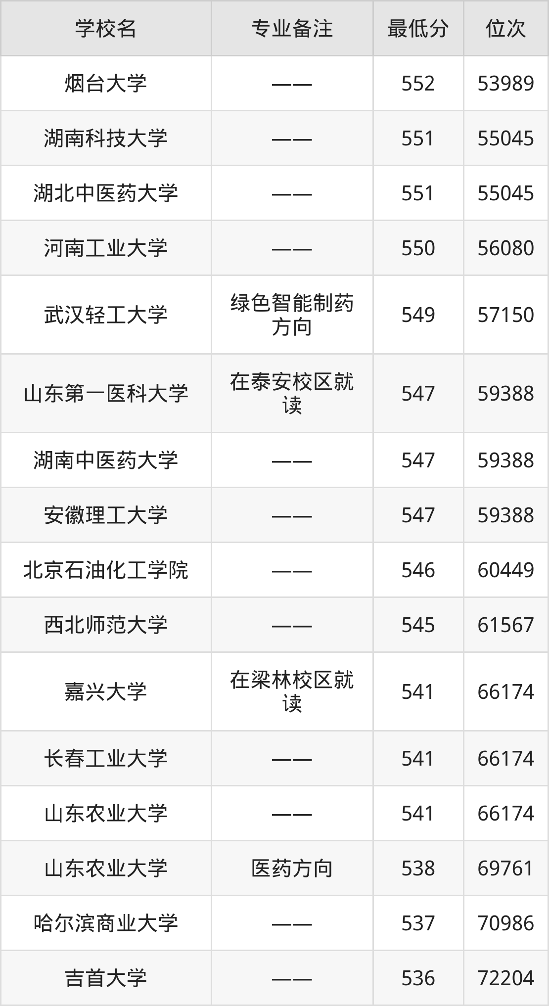 分数线低于510分能上的制药工程大学还有河北北方学院(501分)、吕梁学院(497分)、邯郸学院(494分)、石家庄学院(476分)。