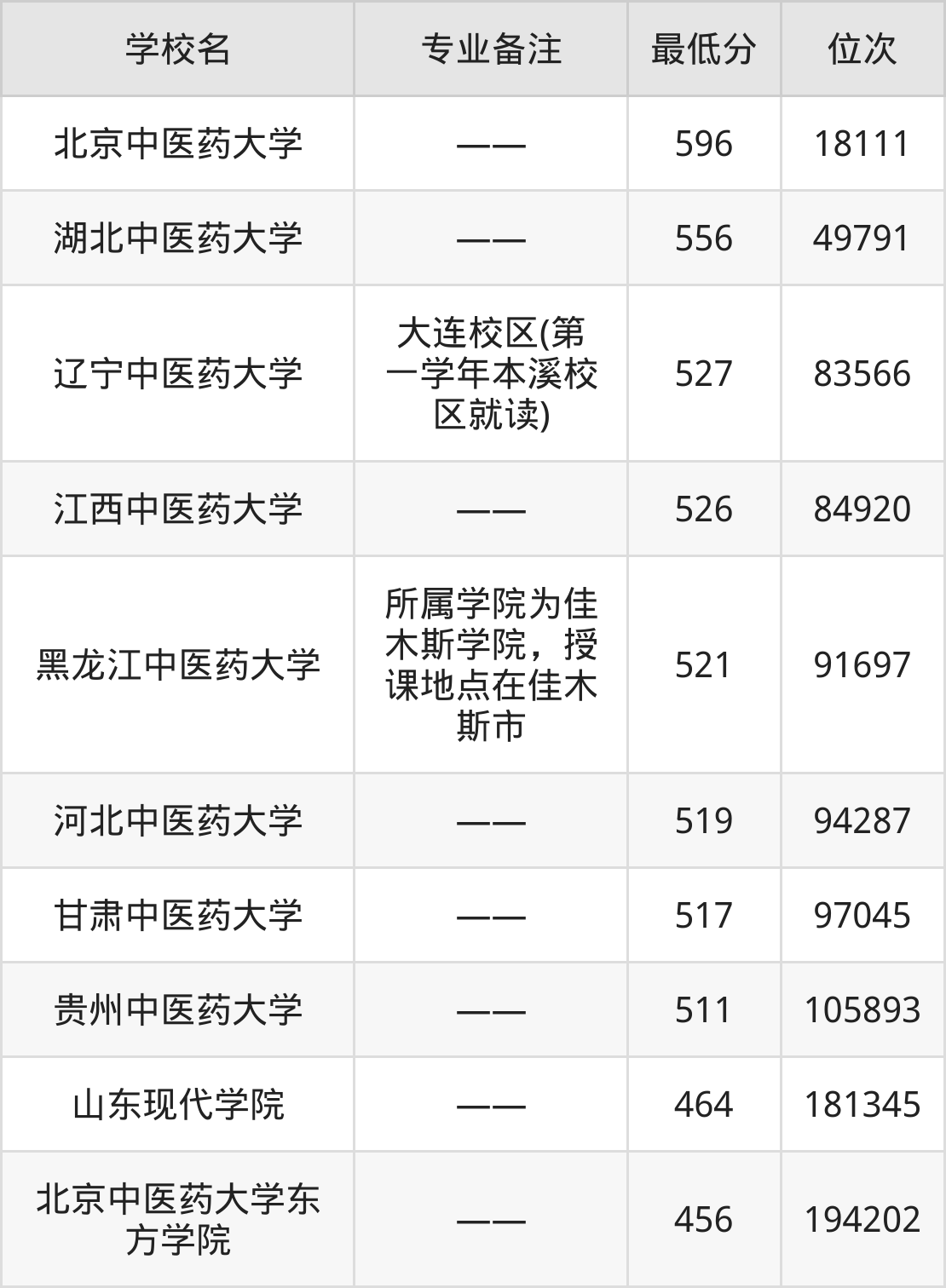院校举例:北京中医药大学、北京中医药大学东方学院、河北中医药大学、山西中医药大学、辽宁中医药大学、黑龙江中医药大学、江西中医药大学、广东药科大学、西藏藏医药大学、陕西中医药大学等。