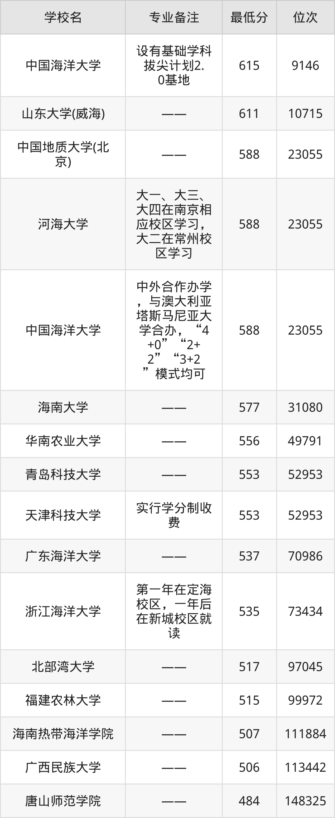 分数线低于520分能上的海洋科学大学还有北部湾大学(517分)、福建农林大学(515分)、海南热带海洋学院(507分)、广西民族大学(506分)。