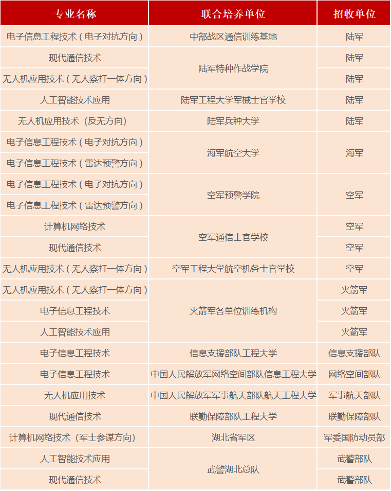 2025年武昌职业学院定向培养军士有电子信息工程技术、计算机网络技术、无人机应用技术、人工智能技术应用等专业方向,面向全国31个省(直辖市、自治区)招生。